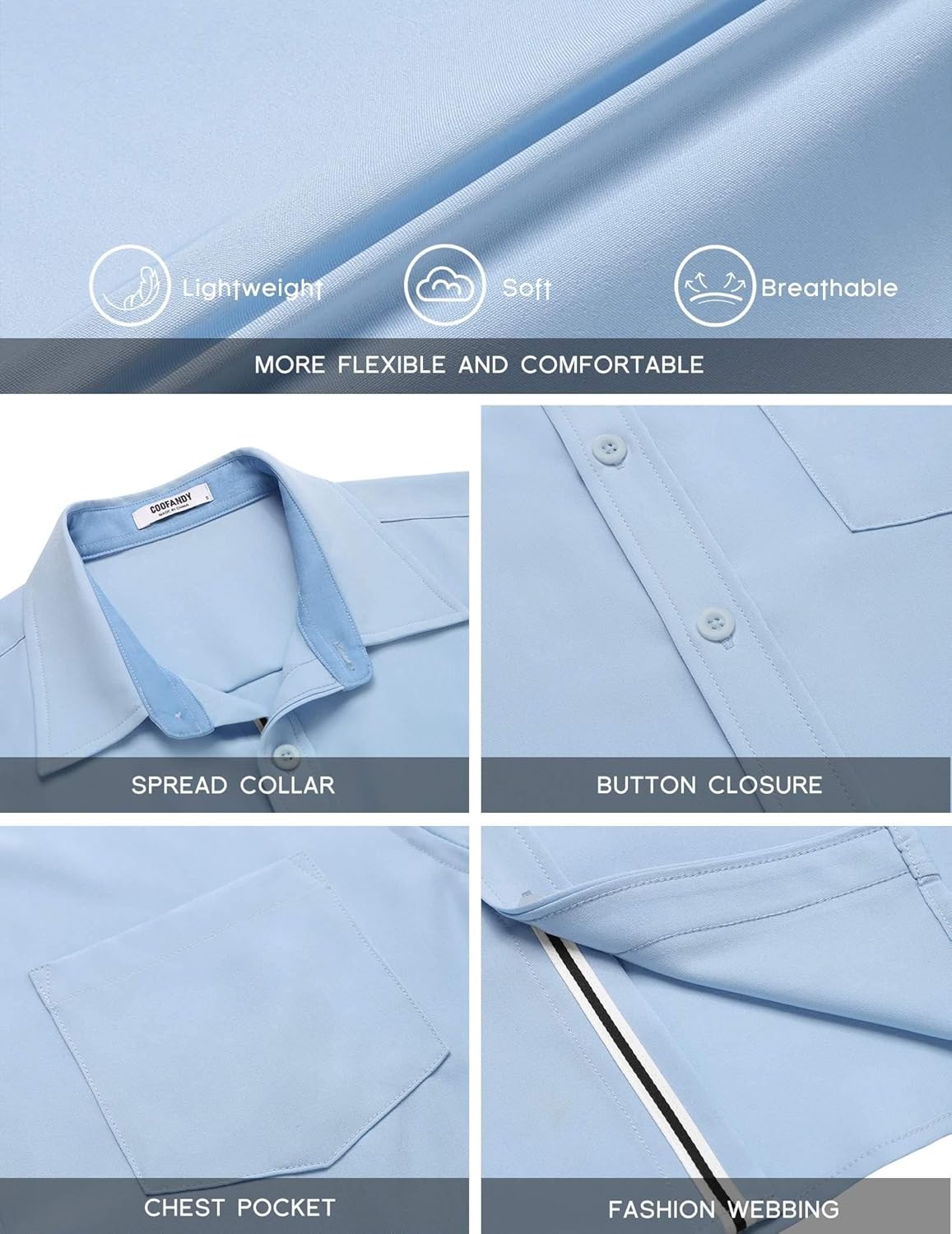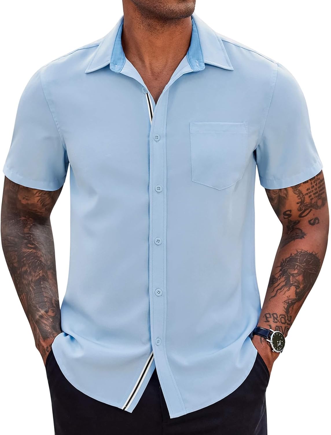 Customers appreciate the shirt’s color, comfort, and fit. They find the color nice, formal-looking, and like the contrast trim. The fabric is soft, comfortable, and breathable. Many are satisfied with the quality, though opinions differ on the material quality.