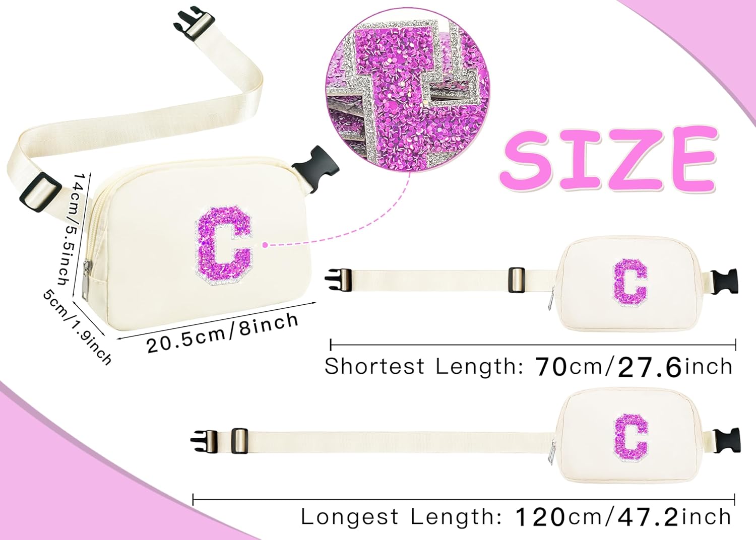 [SEWN Sparkly Bling Letter Patch on the Fanny Pack] Stitched initial letter patch A-Z permanently fixed on the girls belt bag, glitter pieces embroidered firmly, not removal and non-fading upon washing machine support. Preppy initial letter fanny pack, top fashion tween girls trendy stuff and also teen girl gifts trendy stuff.