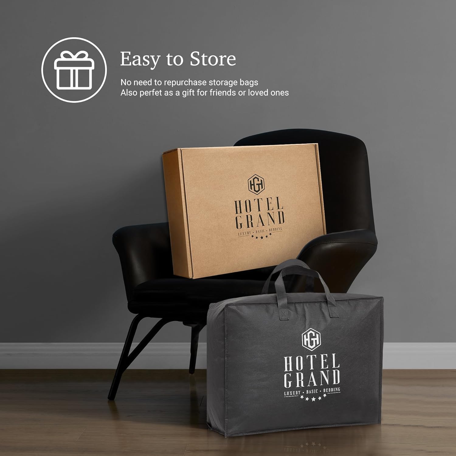 Care Instruction – Hotel Grand duvet insert comes with a vacuum pack, please pat it gently to restore its original fluffiness before use. Alternatively, let it air dry or low heat dry 10 minutes to regain its orginal fluffiness. We recommend using it with a duvet cover to maximize the life of your duvet.
