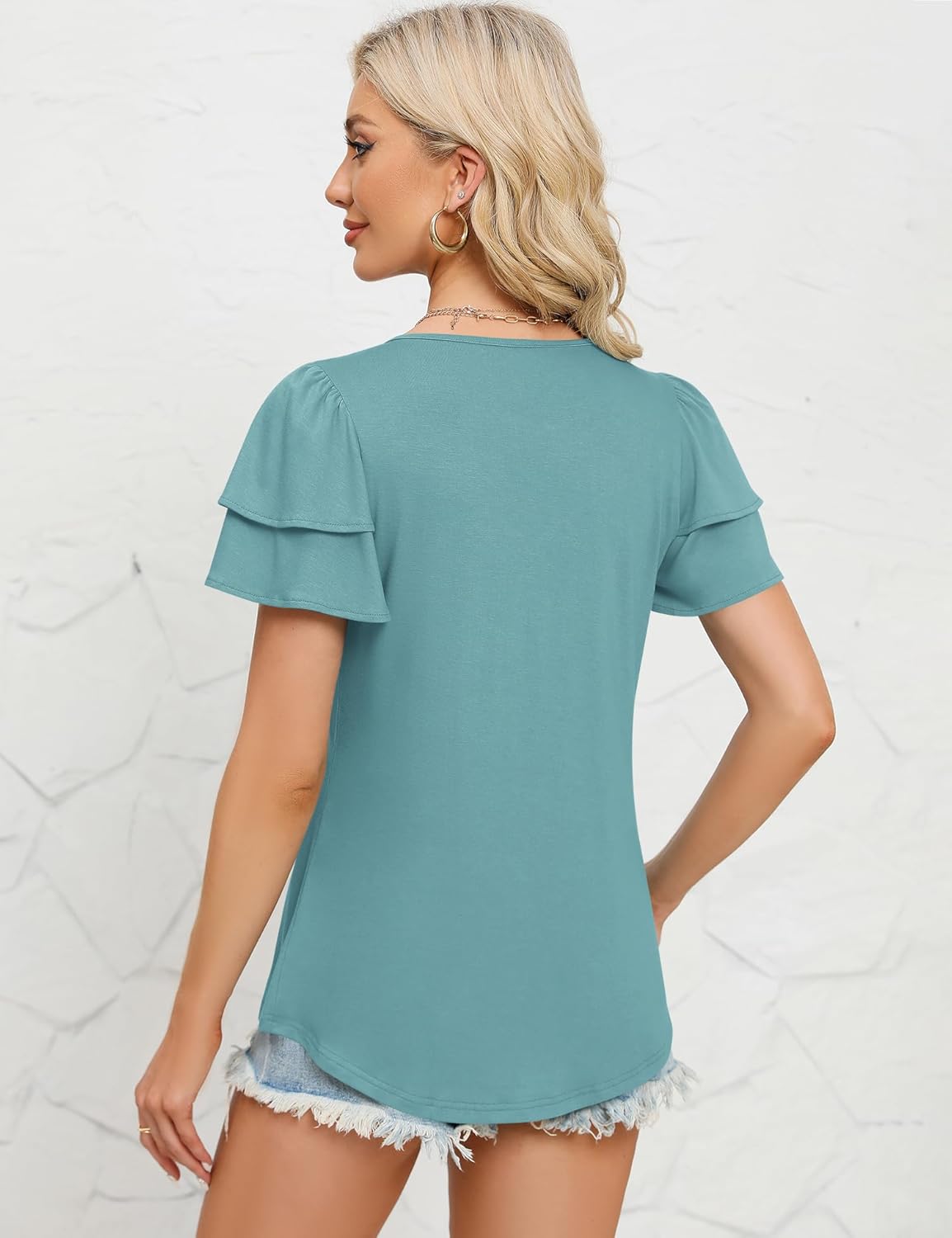 Ruffle Sleeve Tops for Women Summer Shirts Solid Cute Crewneck T Shirts