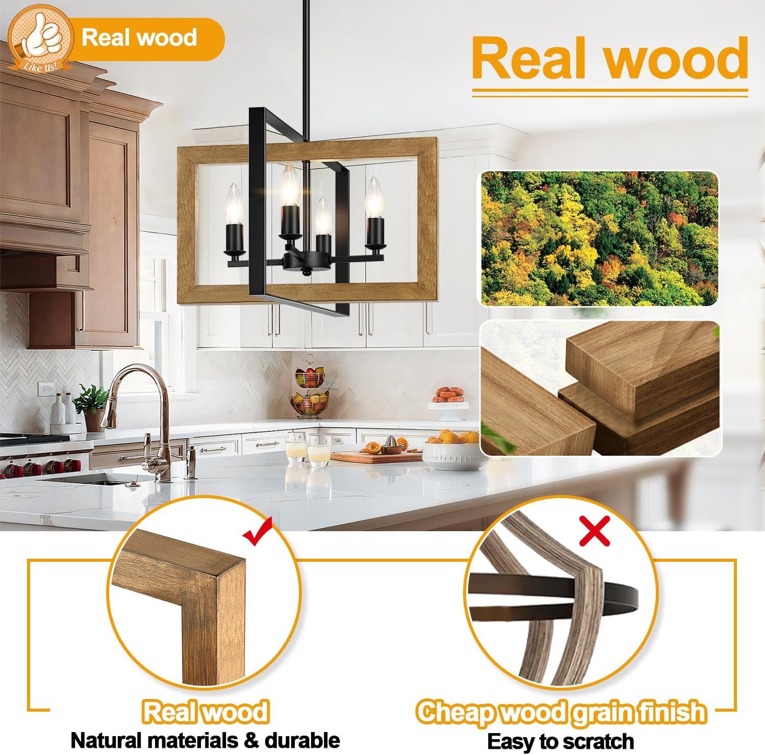 【Bulb Requirement】Equipped with 4 E12 bases, this dining room light fixture over table supports various bulb types, including incandescent, LED, CFL, and halogen (Bulbs NOT Included). Pair this wood farmhouse light fixture with dimmable bulbs and a compatible dimmer switch (Switch NOT Included) for adjustable lighting.