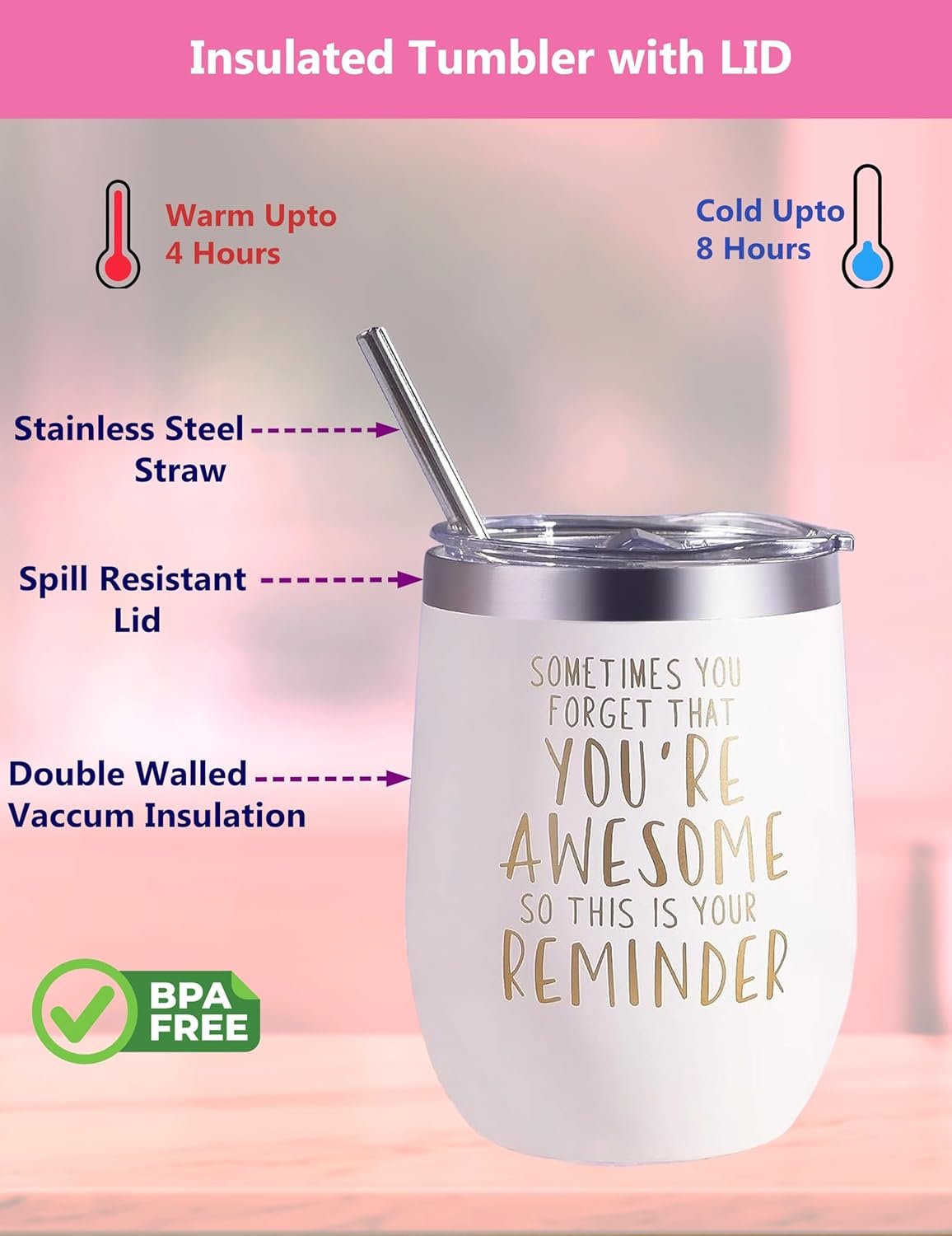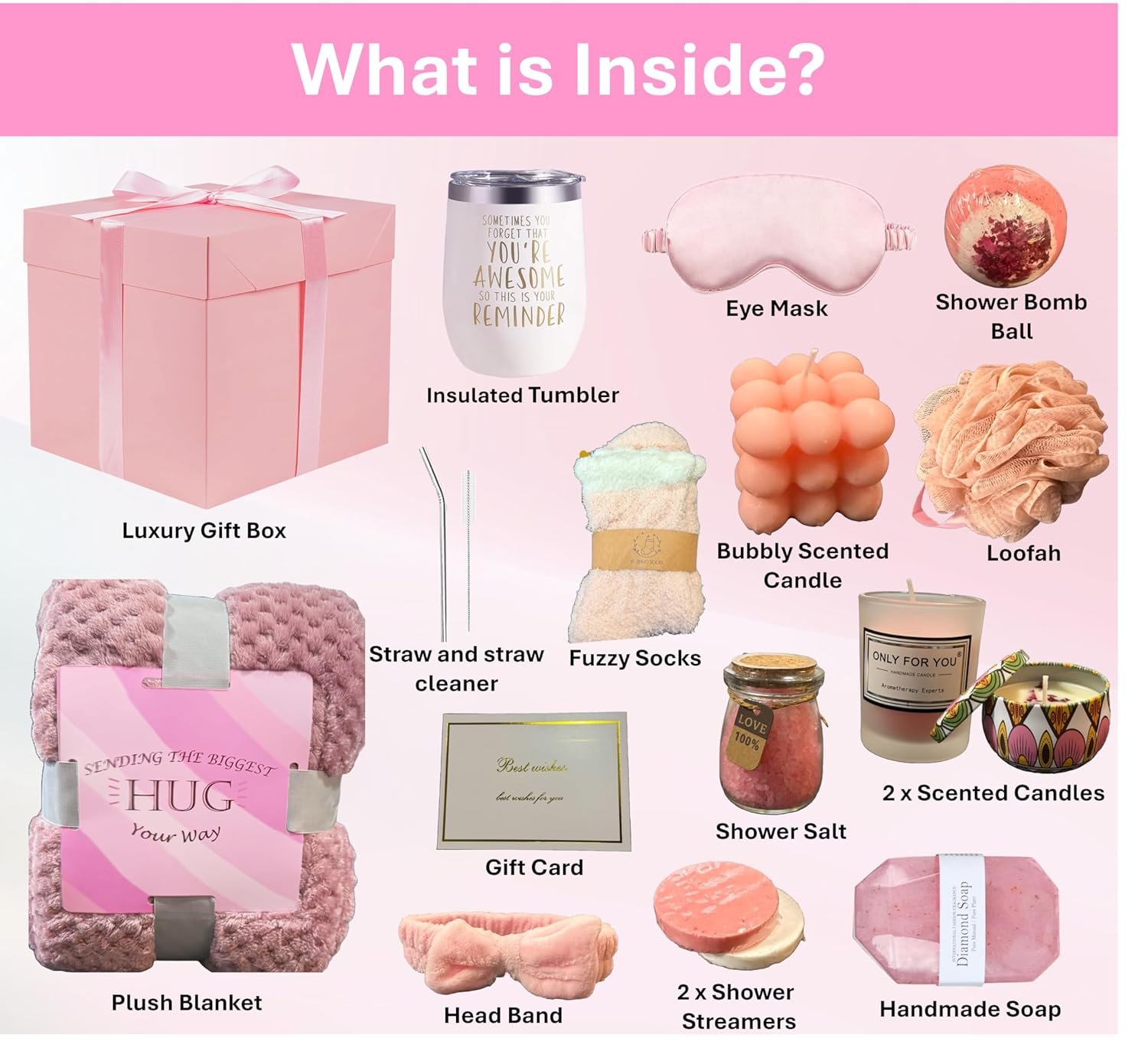 đăPREMIUM, UNIQUE AND LUXURY CARE GIFT SET FOR WOMENă Each box is a set of comforting and therapeutic items, containing 12oz tumbler with a steel straw and cleaning brush, 2 x scented candles, a plush blanket, bubbly scented candle, a pair of cozy fuzzy socks, 2 x bath bomb pieces, bath ball, creamy diamond handmade soap, silk eye mask, headband, shower salt, loofah, and a heartfelt greeting card.