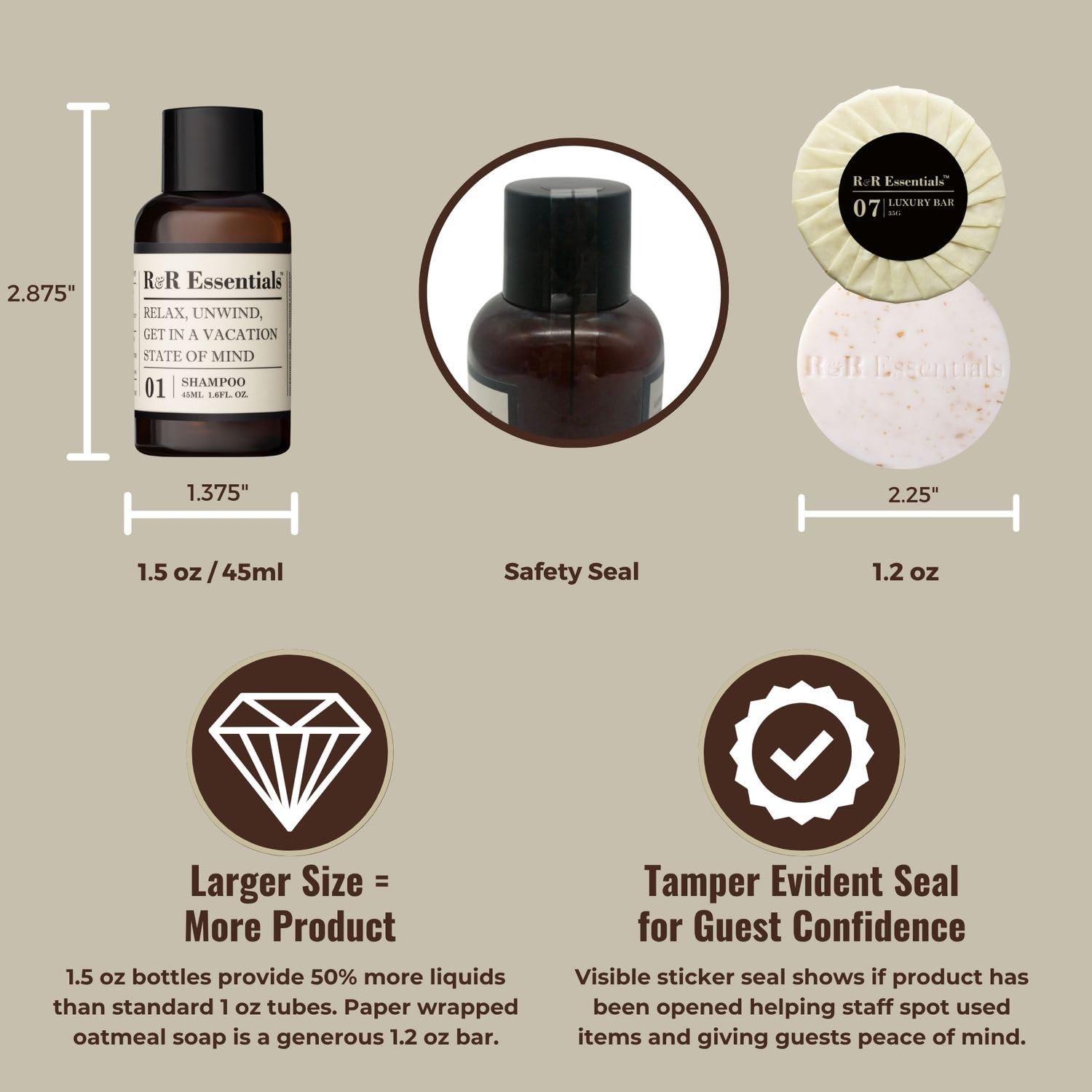 Why choose R&R Essentials: The upscale amber bottles are a generous size at 1.5fl oz – 50% more liquid than the standard 1oz size. Our kit includes two hotel soaps, one body bar soap for the shower and a mini soap for the sink. The classic apothecary style enhances any decor, and the fun saying on the label will make your guest smile! Perfect for hotels, resorts, vacation rentals, Airbnb, VRBO and gift baskets.