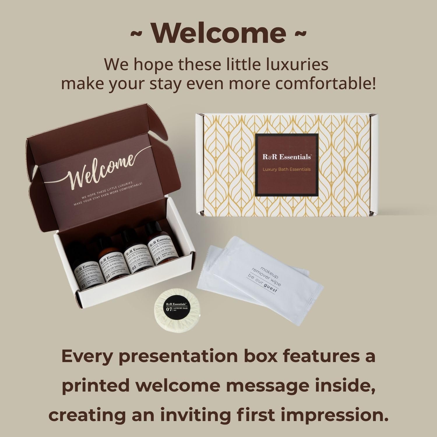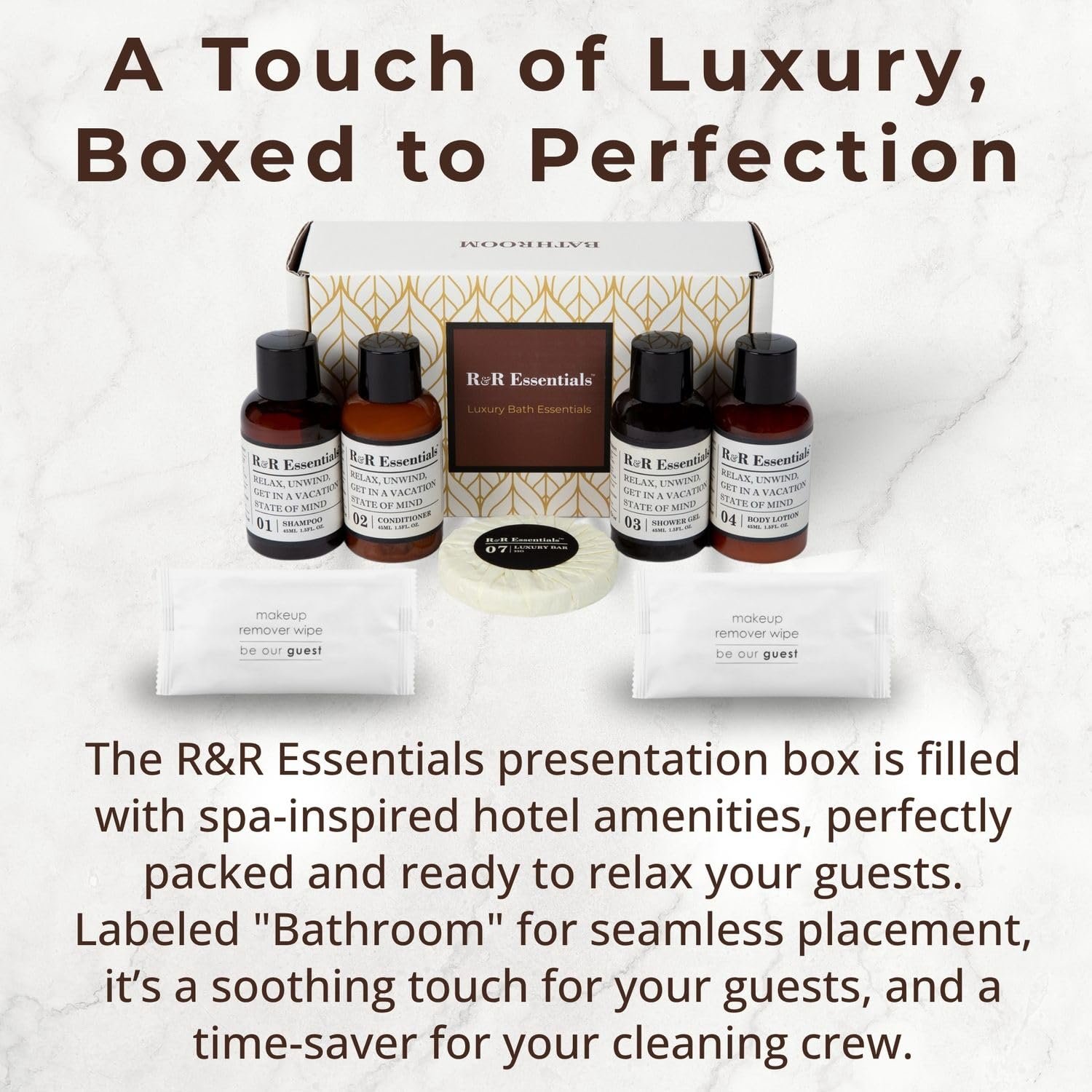 Rental Ready Hotel Toiletries Box Kit: Includes – hotel shampoo and conditioner, shower gel, body lotion, oatmeal soap bar & two makeup removal wipes. Securely packaged in a premium retail-ready kit..
