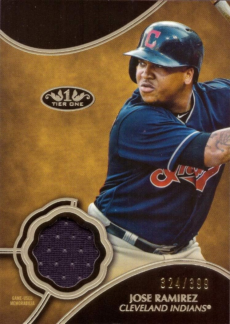 2019 Topps Tier One Relics #T1R-JR Jose Ramirez Game Worn Jersey Baseball Card – Cleveland Indians. This card features a piece of Indians jersey worn by Jose Ramirez during a game. Its authenticity can be found on the back of the card. In addition, this card is serial numbered to 399, meaning only 399 of these cards were produced. Card is in Near Mint to Mint condition. Stock photo shown.