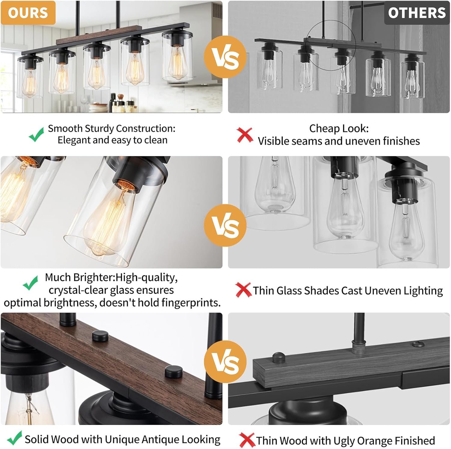 [2025 Upgraded Farmhouse & Modern Design] Upgraded smooth sturdy construction and solid wood with antique looking (instead of ugly orange finished) and black solid metal, this 5-light glass pendant lights kitchen island combines rustic charm with modern elegance. The sturdy yet minimalist frame and crystal-clear glass shades add a sophisticated touch to your dining room or kitchen island, add much brighter and bring you a ton of compliments