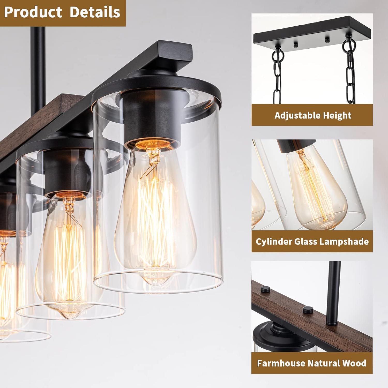 [Much Brighter & Dimmable Farmhouse Kitchen Island Lighting] Designed with 5 E26 sockets (Max 60W per bulb, bulbs not included), this farmhouse pendant island light fixtures for kitchen is compatible with LED, incandescent, CFL, and Edison bulbs. 5 light black dining room light fixtures over table wood farmhouse is dimmable. Easily adjust brightness levels with a dimmable switch and bulbs to create the farmhouse ambiance for any occasion