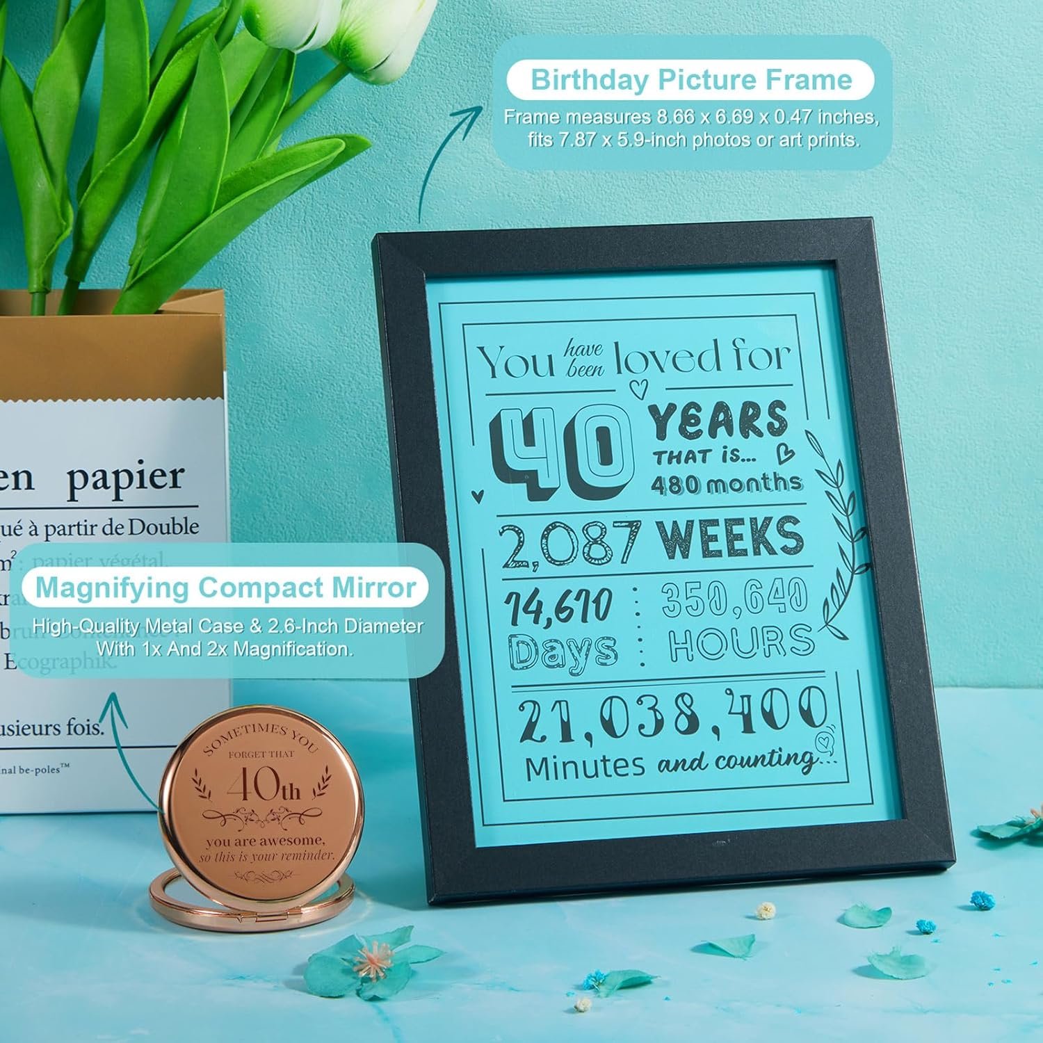40th Birthday Gifts For Women :The Gifts Set Also Includes a Soft Spa Headband, Perfect For Bathing And Face Washing, Along With Soft Heart-Shaped Plush Socks And a Silk Eye Mask To Provide Her With a Better Quality Of Sleep.2.6-Inch Diameter Magnifying Compact Mirror With 1X And 2X Magnification. 2X Magnification Is Perfect For Close Up Tweezing, Applying Mascara, While 1X Magnification Reflects a Clear Image Of The Entire Face.