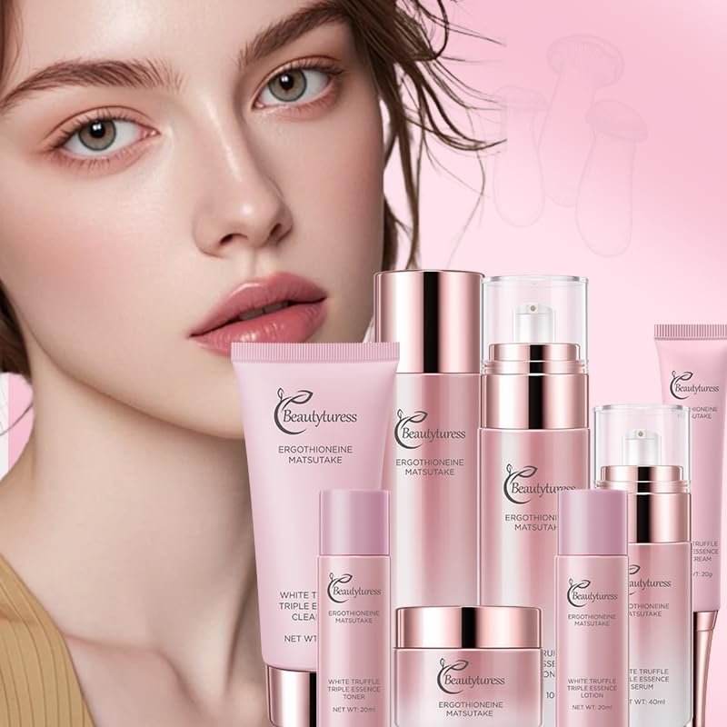 BEAUTYTURESS 8-Piece Korean Luxury Ergothioneine Skincare Set provide deeply moisturized skin. This premium Korean skincare set is expertly formulated with ergothioneine, nourishing matsutake extract and hydrating hyaluronic acid to provide intense moisture while locking it in for long-lasting results. Perfect for all skin types, this complete 8-piece regimen offers gentle yet effective daily care.