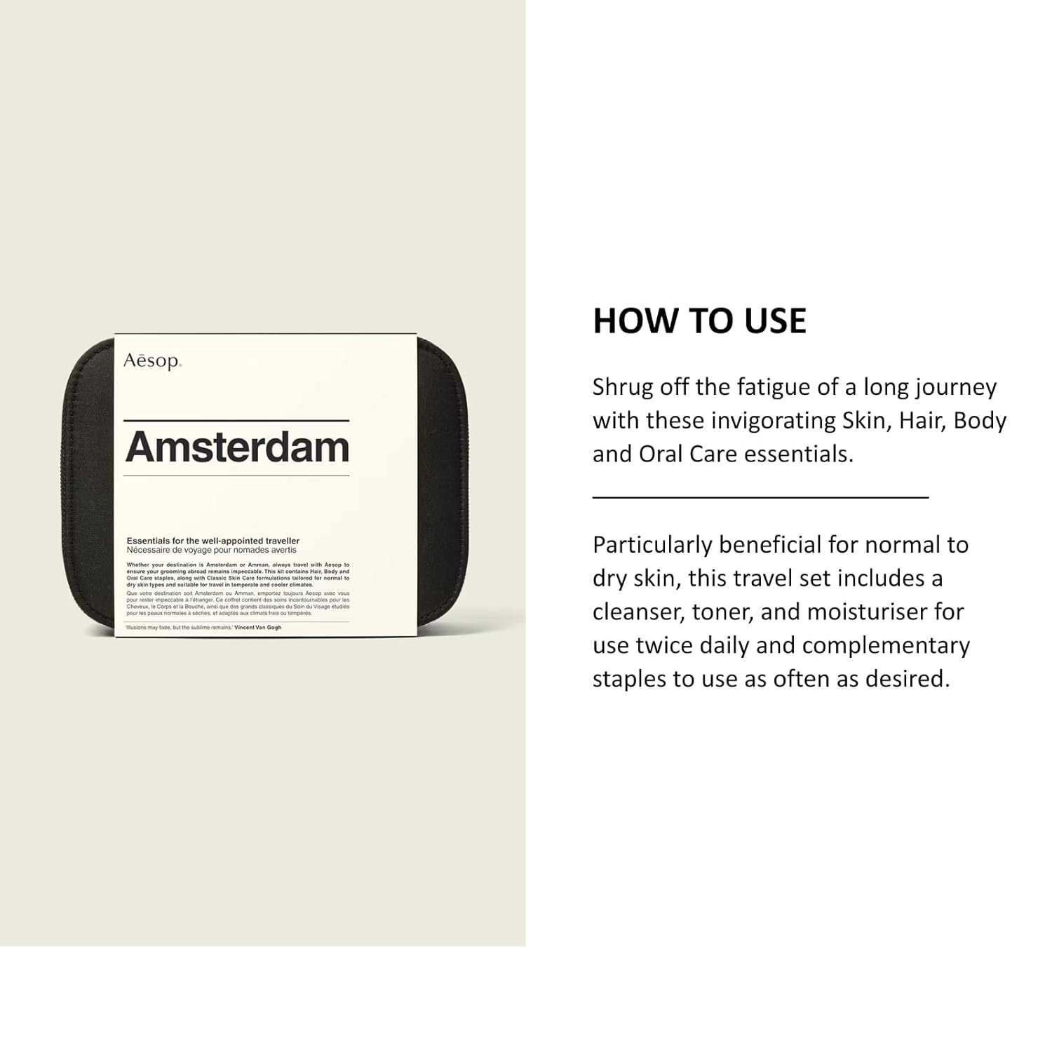 About this kit: Nine travel-sized essentials best suited to temperate and cooler climates, and normal to dry skin.