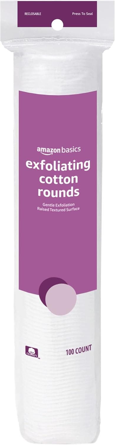 Amazon Basics Exfoliating Cotton Rounds, 100 Count, Dual sided, one side with raised textured surface and the other soft embossed surface, Use the raised textured surface side to gently scrub and exfoliate the face