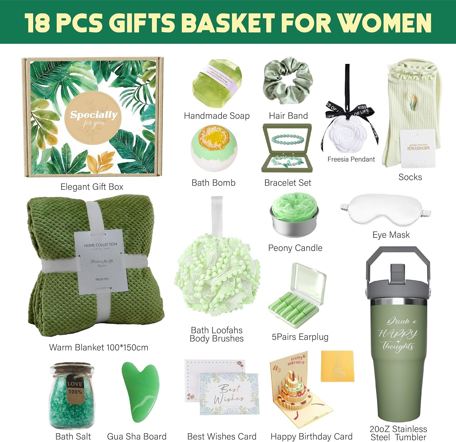【18PCS SELF CARE GIFTS FOR WOMEN】Each item of self care basket is hand-picked to make her feel nurtured and cared for. What’s inside! (1)Flannel Blanket 100*150cm (2) 20oZ Tumbler (3)Peony Candle (4)Aromatherapy Pendant (5) Soap (6)Bath Bomb (7)Bath Salt (8)Bath Body Brushes (9)2 Butterfly Bracelet (10)Bracelet Box (11)5Pairs Earplug (12)Silk Eye Mask (13)Silk Hair Band (14)Gua Sha Board (15)Socks (16) 3D Happy Birthday Card (17)Best Wishes Card (18)Luxury Gift Box. Perfect gift ideas for women!
