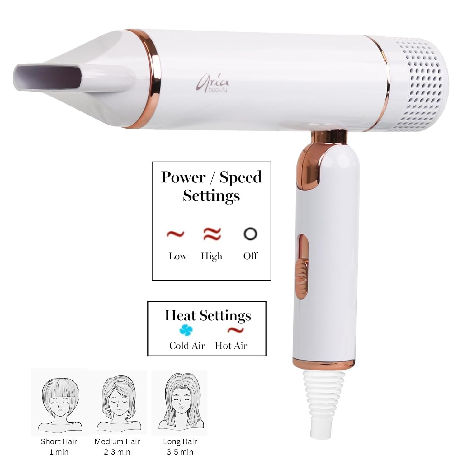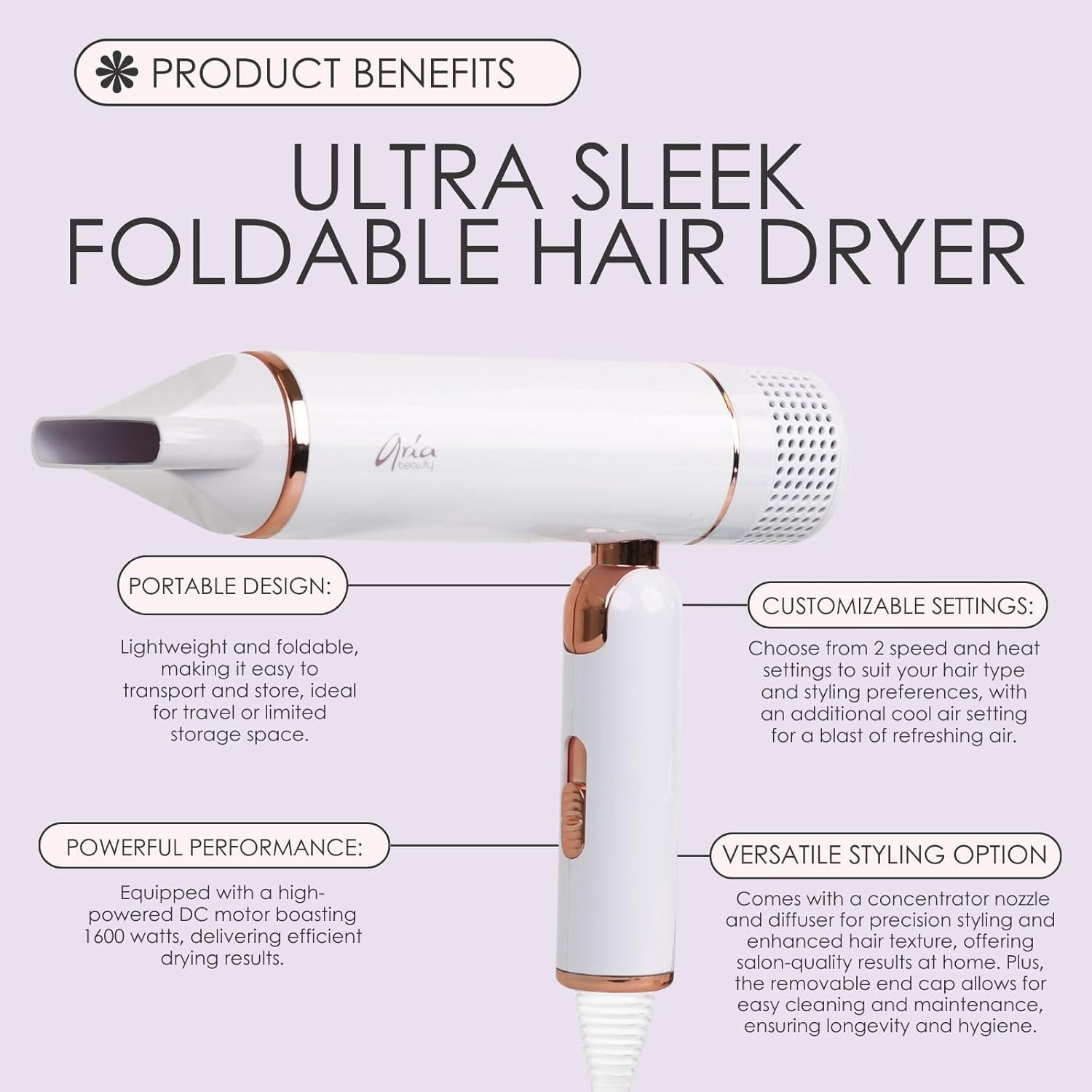 Introducing the Aria Beauty Ultra Sleek Foldable Hair Dryer, a hair styling tool that brings the salon experience to your home. This hair dryer blends convenience with durability to offer an ultimate hair styling solution. It is a powerful, yet lightweight hair dryer that provides professional blow dry results. Its flexible design allows you to achieve volume, softness, and a boost of shine in your hair. The foldable hair dryer is designed with a high-powered DC motor that offers a unique blend of power and efficiency.