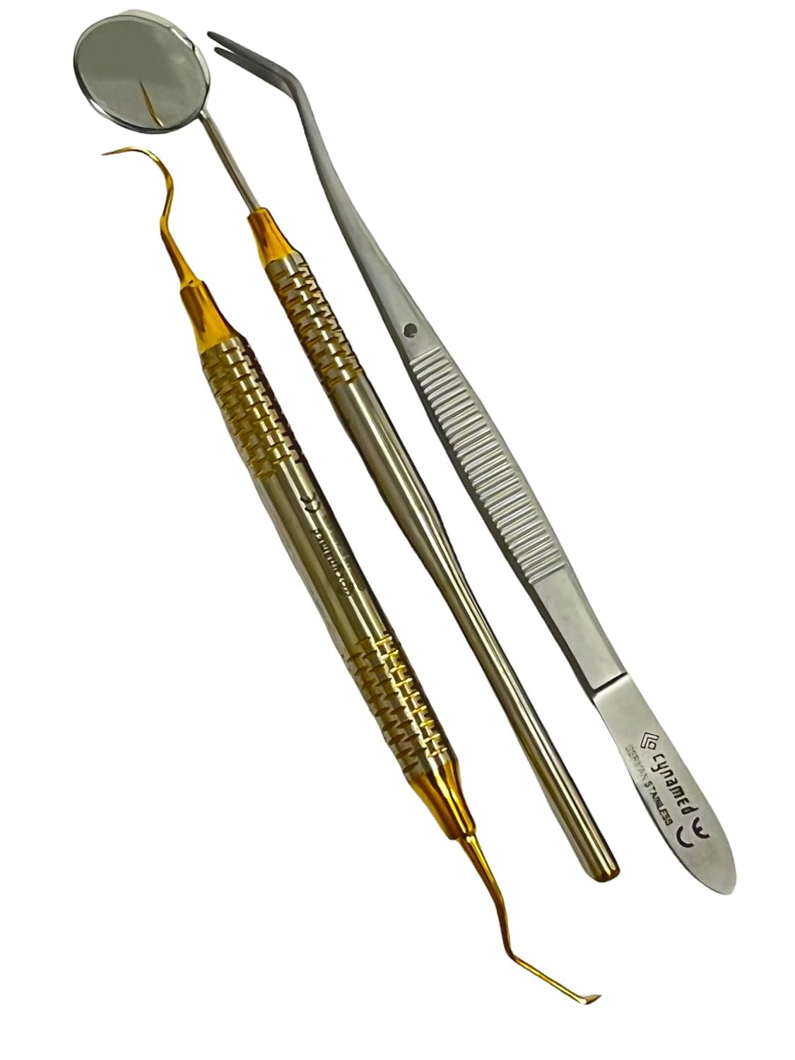 ArTLaB-Premium German 3 Instruments Basic Dental Set- Mirror Explorer College Cotton Plier Hollow Handle -Dental Instruments set of 3 ArTlaB-3PC BASIC DENTAL TOOL SET: These Premium German Hollow Handle 3 pcs Basic Dental Instruments Set is the perfect kit for a dental clinic, office, or at home use. The premium quality construction allows each tool to be re used after proper sterilization for the highest value. Get 3 of the most commonly used dental examination instruments in one place for an affordable price. The package includes 1 Dental Examination Mirror, 1 Dental Pick, and 1 Dental Explorer.