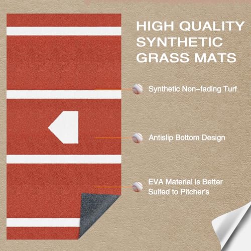 【Non-Slip And Anti-Fade】Our baseball turf mat are made of new synthetic turf, which is 100% UV resistant turf, with a 5mm non-slip backing to provide perfect traction for the hitter and ensure stability when you hit the ball; even as any lines on the baseball batting cage mat cushion are inlaid so that they would possibly not fade, break, or flake off, even in harsh outdoor conditions. Note: As a result of different shooting conditions may appear figure and the actual slight color difference, please do not mind.