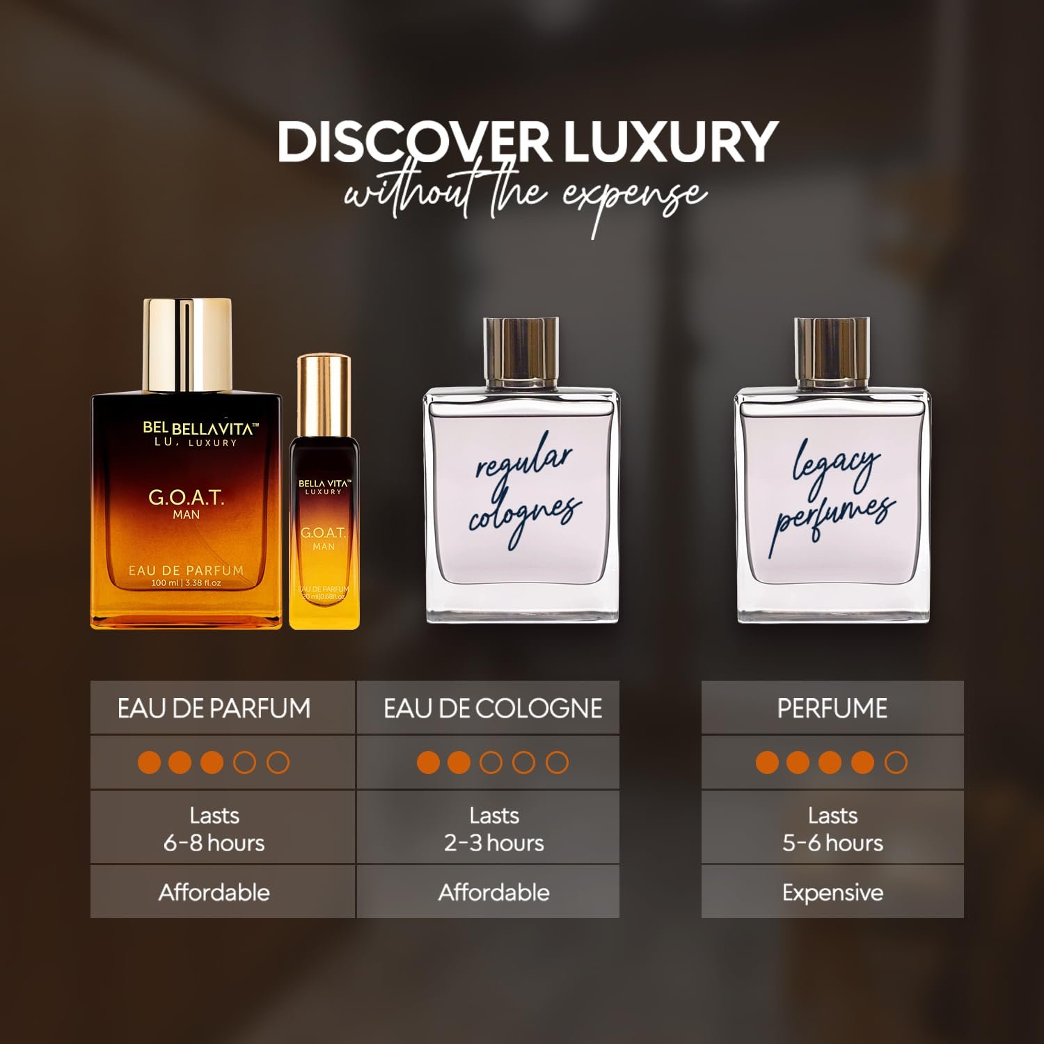 đ Powerful & Masculine â Luxury G.O.A.T. Men’s Eau De Parfum cologne is crafted for the modern man. This bold mens cologne blends refreshing Bergamot, calming Lavender, and deep Patchouli Oriental fragrance notes, creating a sophisticated yet energizing aroma. Man Designed for those who demand excellence power and dominance, this long-lasting cologne for men leaves an unforgettable impression from day to night.