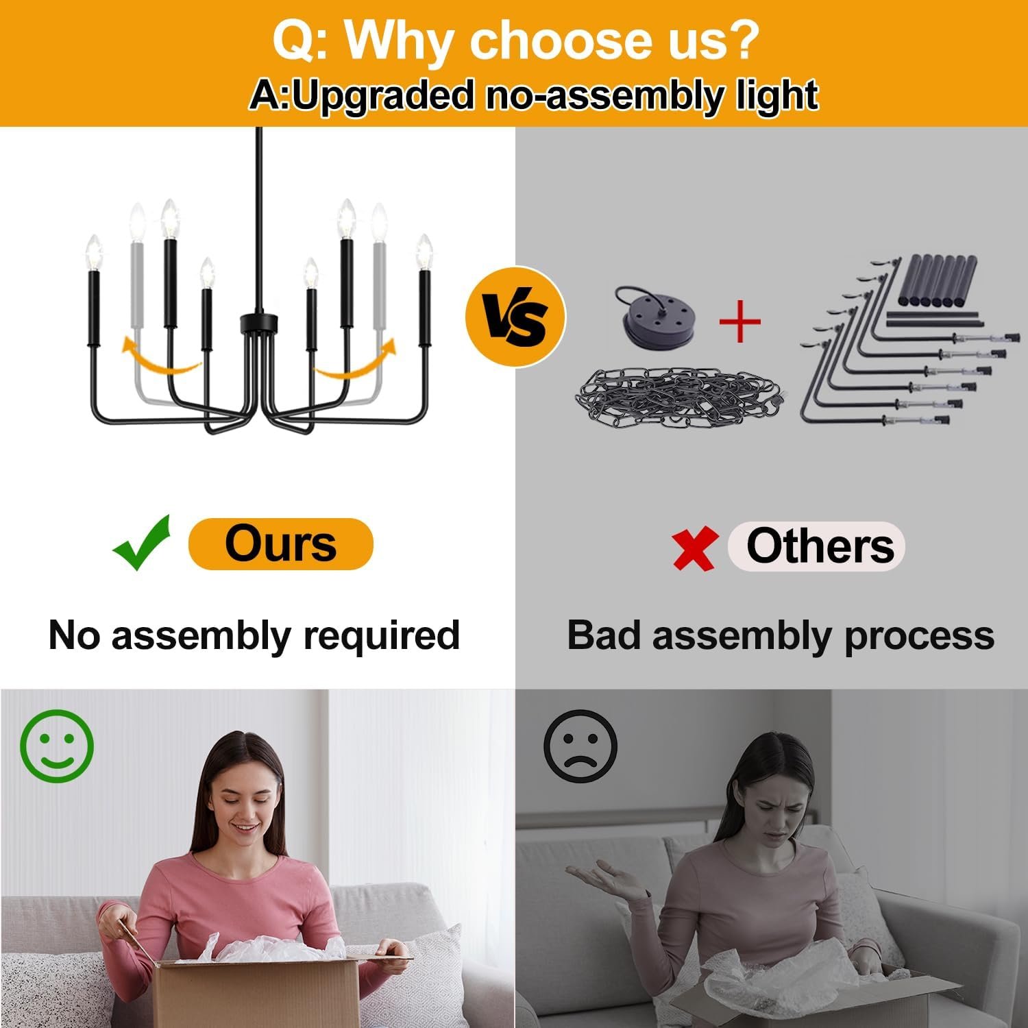 No Assembly & Easy Installation: The lamp arm part has been pre-assembled, just unfold the gathered lamp arms to complete the assembly of the black chandelier, assembly becomes a breeze! Besides, our farmhouse chandelier comes with all the necessary parts and detailed instructions for hassle-free installation.