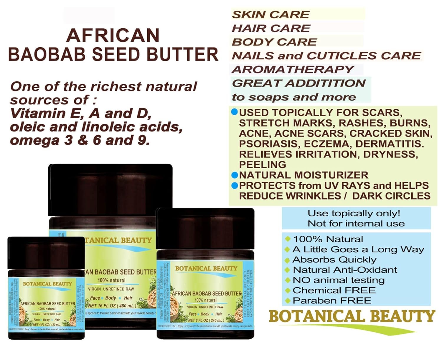 Botanical Beauty BAOBAB SEED OIL BUTTER RAW is high in linoleic acid and also contains alpha-linolenic acid, oleic acid, phytosterols, phospholipids, vitamin C, vitamin E ( tocotrienols and tocopherols), vitamin A, vitamin F, Vitamin D, omega 3, omega 6 omega 9 essential fatty acids, ideal light moisturizer for everyday use. Nature’s Perfect moisturizer. It is an excellent addition to your natural sun protection products. A Little Goes a Long Way, Absorbs Quickly, Not Greasy, Not tested