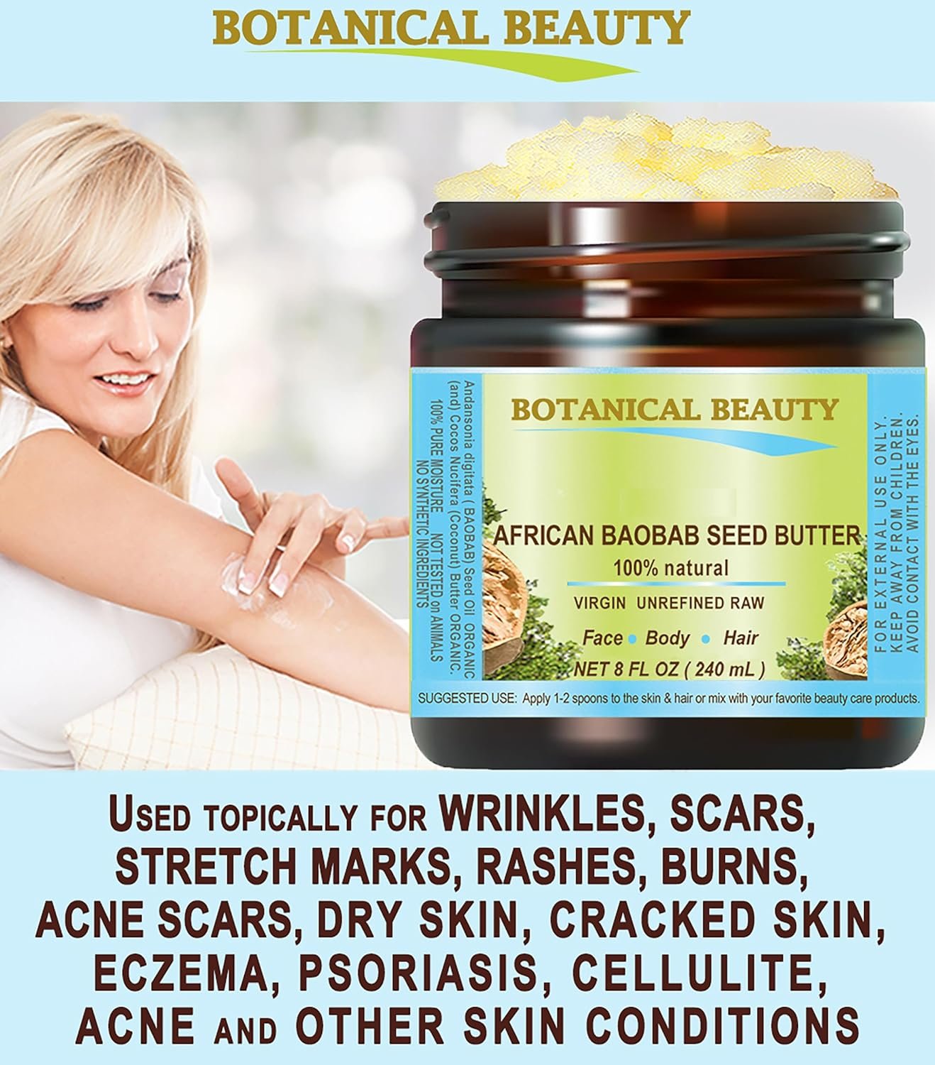 Botanical Beauty BAOBAB SEED OIL BUTTER is currently considered to be the best oil butter for natural skin care butter with healing restorative properties for all skin types, especially for dry or mature aging skin, chapped and cracked skin, balances the moisture in the skin, and leaving skin soft and smooth.