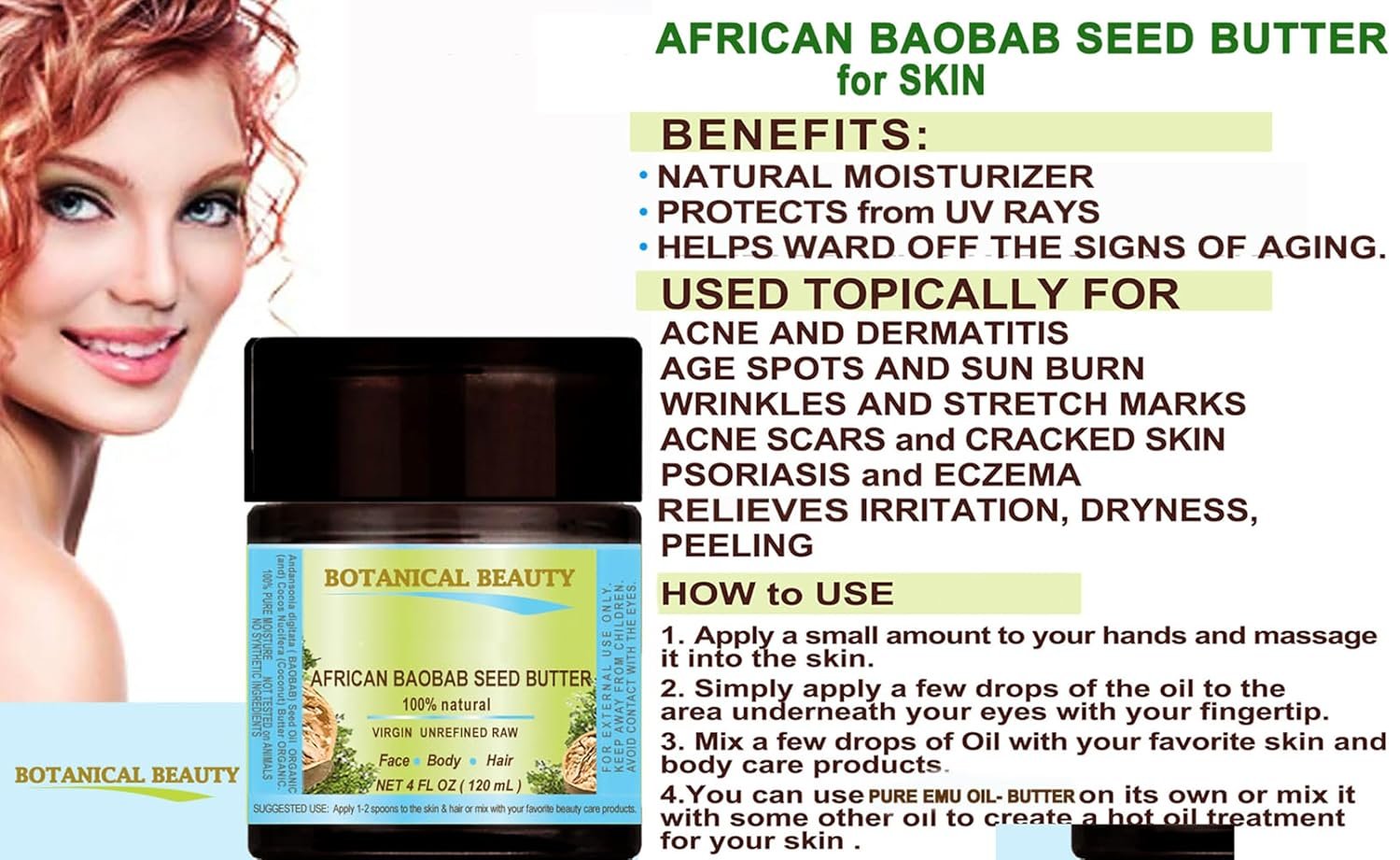 BAOBAB SEED OIL BUTTER is RAW BUTTER.BAOBAB SEED OIL BUTTER is suitable for all skin types, and it can be used for face, hair, lip, and nail care.Anti-aging, Anti-wrinkle, Brightening, Hydrating, Moisturizing, Nourishing, Rejuvenating, Smoothening, Softening, SoothingA Little Goes a Long Way, Absorbs Quickly, Not Greasy, not tested on Animals, does not contain any preservatives, artificial colors or fragrancesKeep in refrigerator.Plastic Jar with spoon.Ingredients: Andansonia digitata (BAOBAB) Seed Oil ORGANIC (and) Cocos Nucifera (Coconut) Butter ORGANIC.