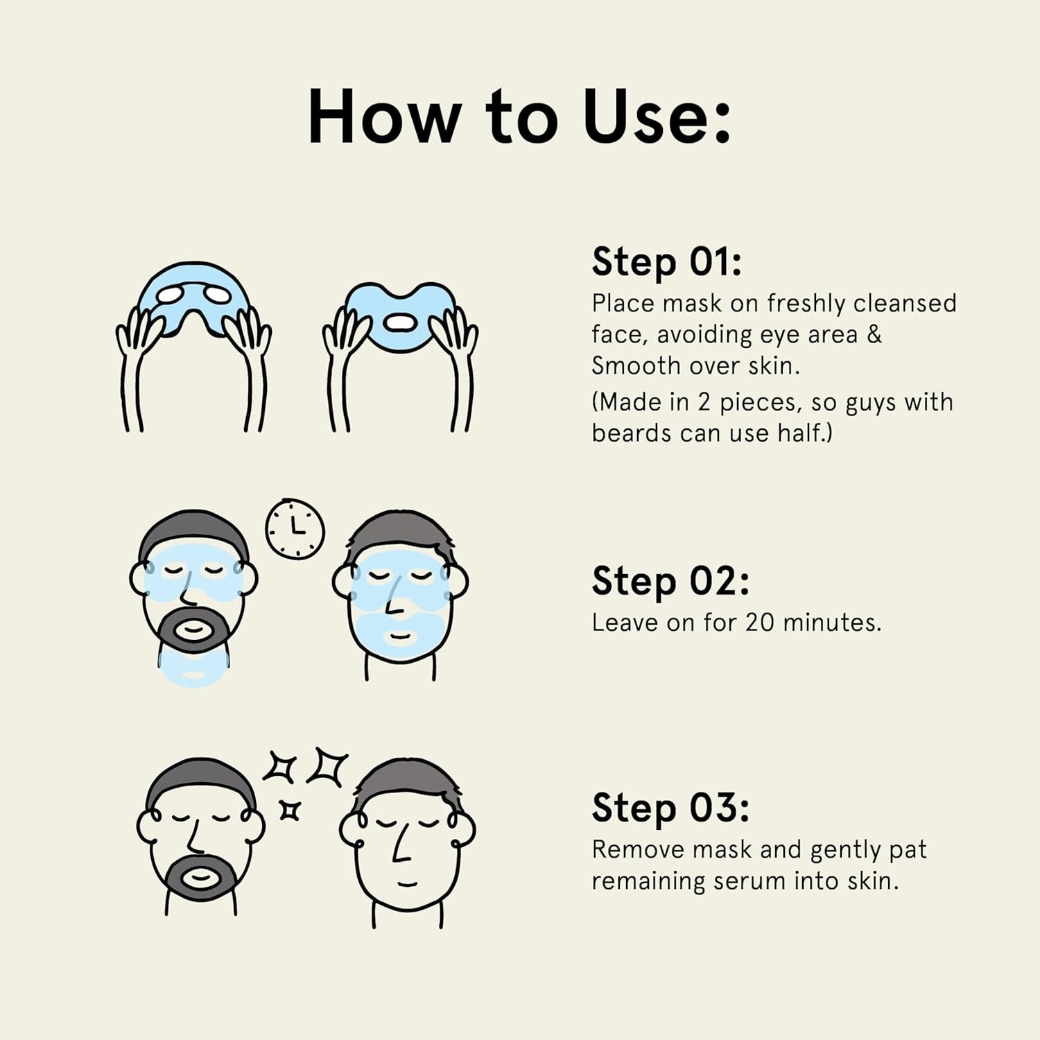 ⭐ EXTRA LARGE FACE MASK FOR MEN: Our large, durable face mask sheets won’t tear on application. They’re AWARD WINNING –Rated best face mask by Men’s Health, New York Magazine, Gear Patrol & The Manual; our collagen face mask wont strip face oil but is an ultra hydrating face mask sheet that helps regulate sebum production. Who says beauty and skin care are for women? This hydrogel clear mask beats a paper mask & finally solves the beard struggle –A face mask for bearded men! (2 Pcs)