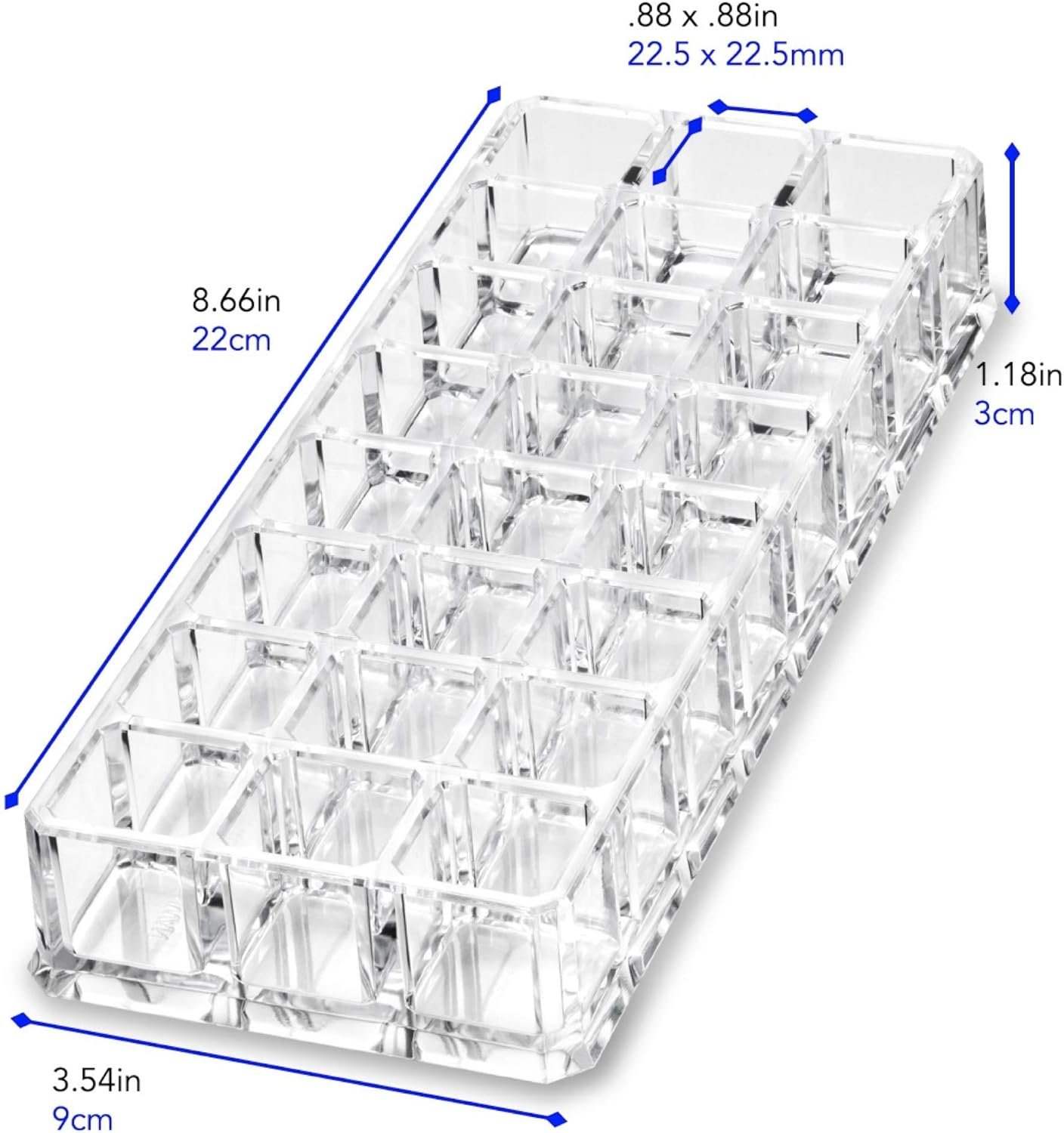 24 Spaces for standard sized lipsticksMade from a single piece with no glued piecesDesigned with beveled edges resulting in no sharp edgesMade with pure crystalline acrylic mimicking the look of glassDesigned with a bottom flared edge for style and added stabilityFits standard sized lipsticksThe increased wall height allows for stability when movingTurn and store your products upside down to see bottom product description or see our wide range of clear lipstick replacement caps