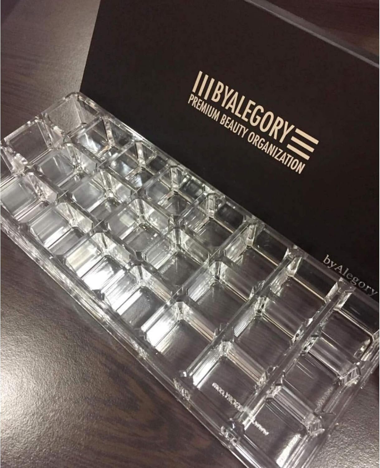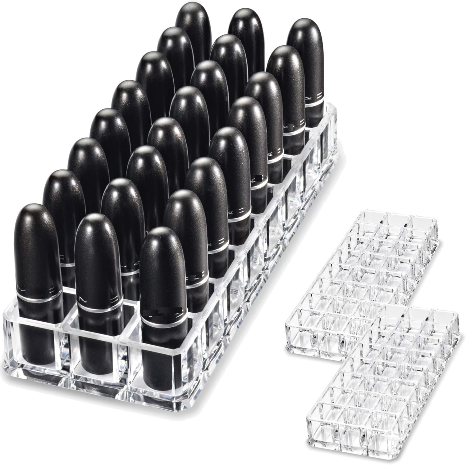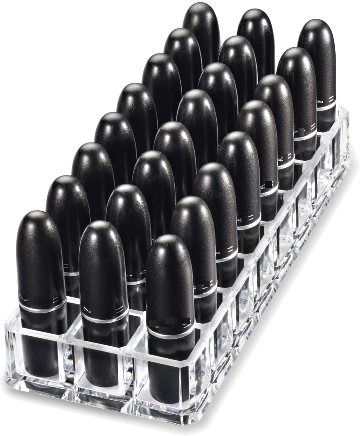 This BY ALEGORY premium acrylic lipstick organizer comes with 24 individual spaces for storing standard sized lipsticks.