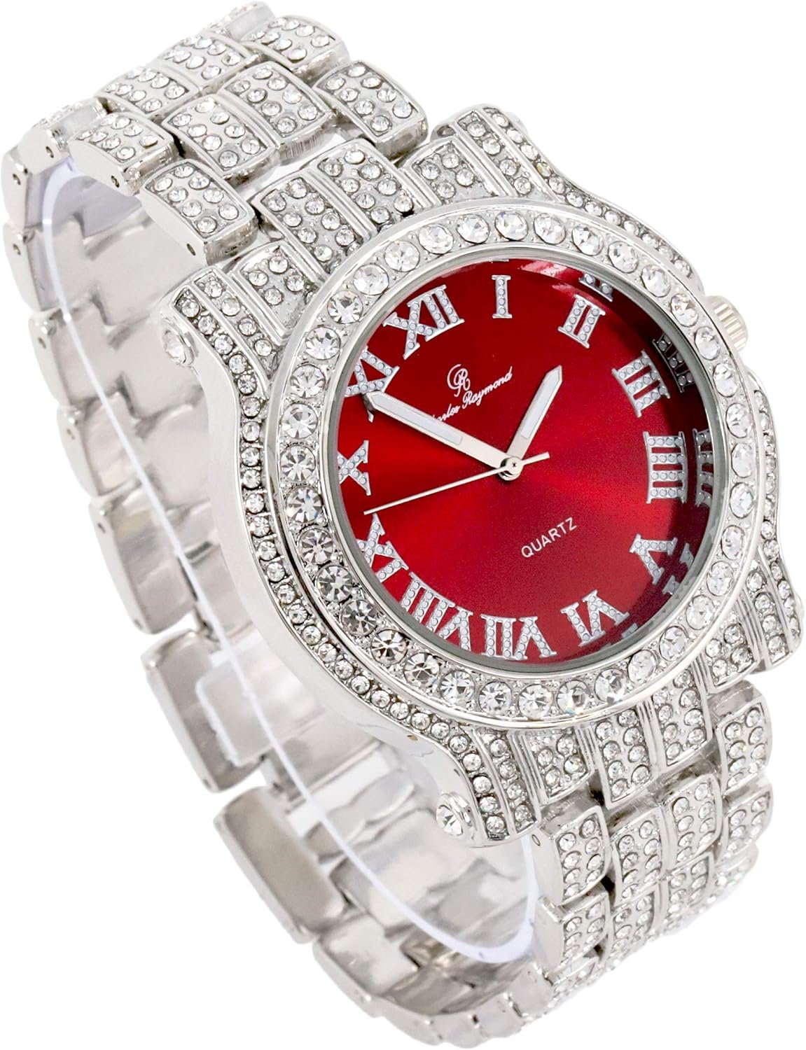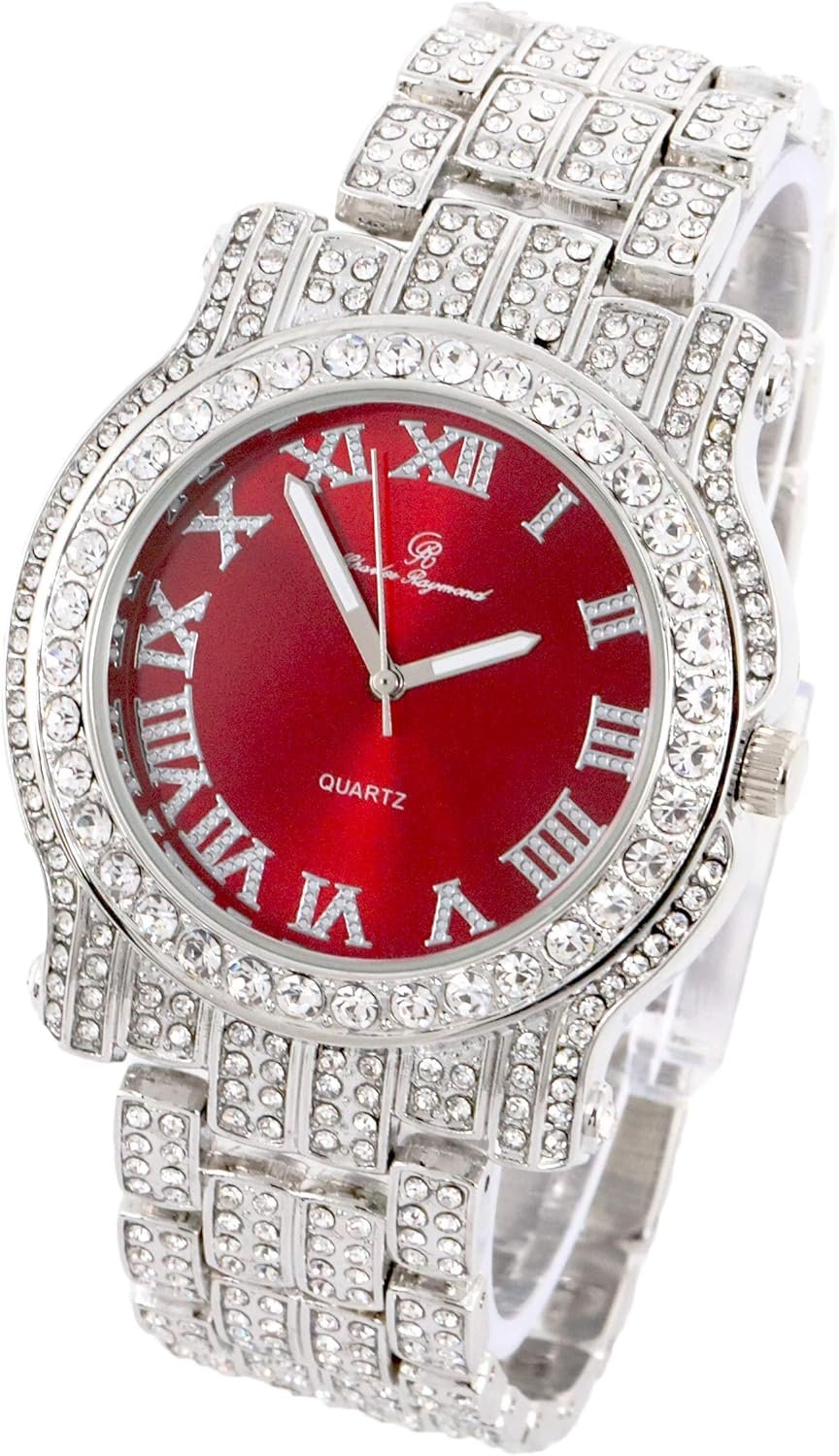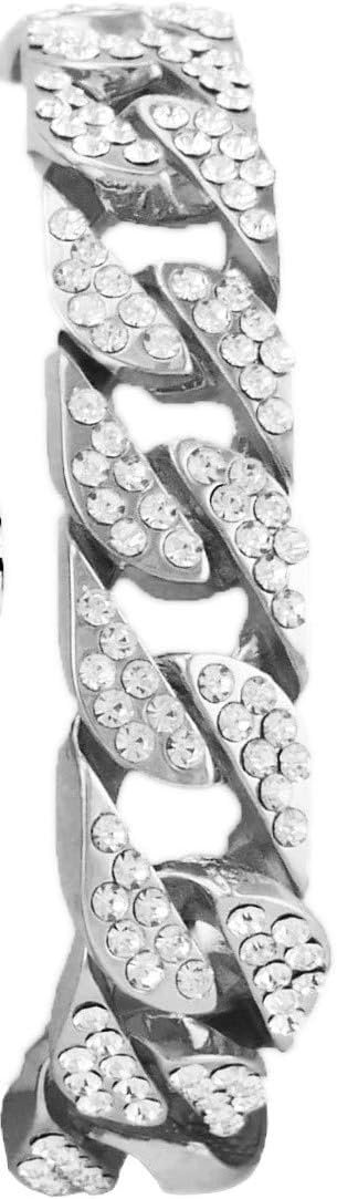 Elegance fit for a King.The timepiece to project from afar, true royalty. Imperial curved casing, decorated to the fullest with clear crystal rhinestones. Fancy case holds 36 diamonds on watch trim and sides of band is enhanced with plenty more ice. Both Watch and Bling’ed Out Cuban Bracelet designed to lure eyes to your swag. Hip Hop Bling Bling 8’5″ Watch w/ 8″ Cuban Bracelet in Gift Box. If too long can be adjusted and made smaller by jeweler. Detail touch of single larger studded rhinestone, at each corner of the swirled out casing adds distinction. Heads will turn when they see you wearing this timepiece. Timepiece and jewelry inspired by what all rappers are wearing!! The grandeur of the watch dial is above any other, projecting empowerment with its luxurious dial decorated with 12 rhinestones encased in silver or Roman Numerals, your choice, each showing off a richer look and making it an easy time reader. Crystals on watch are simulated diamonds. Watch bracelet is an easy open jewelry bracelet design which measures 8.5″ and makes it easy to put on and take off. One extra link added to band can easily be removed to make size smaller, to fit 8″ wrist. Japan Movement Parts Assembled in Singapore – Stainless Steel Back Cover on Watch, Customer satisfaction is guaranteed. Watch size: 8.5″ long adjustable to 8″ long – Dial size: 1.75” . Band Width: 0.85″ – Cuban Bling’ed Out Bracelet measures: 8″ long