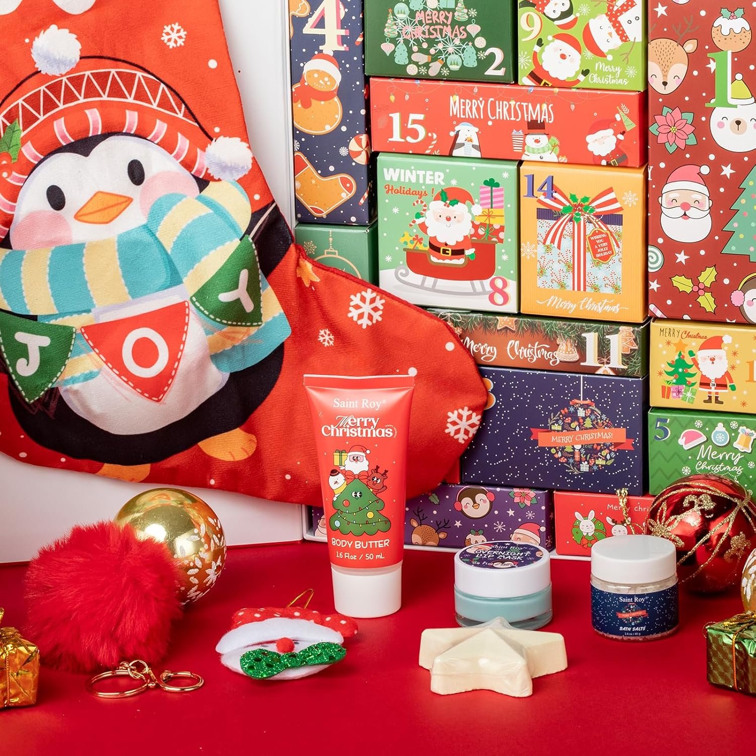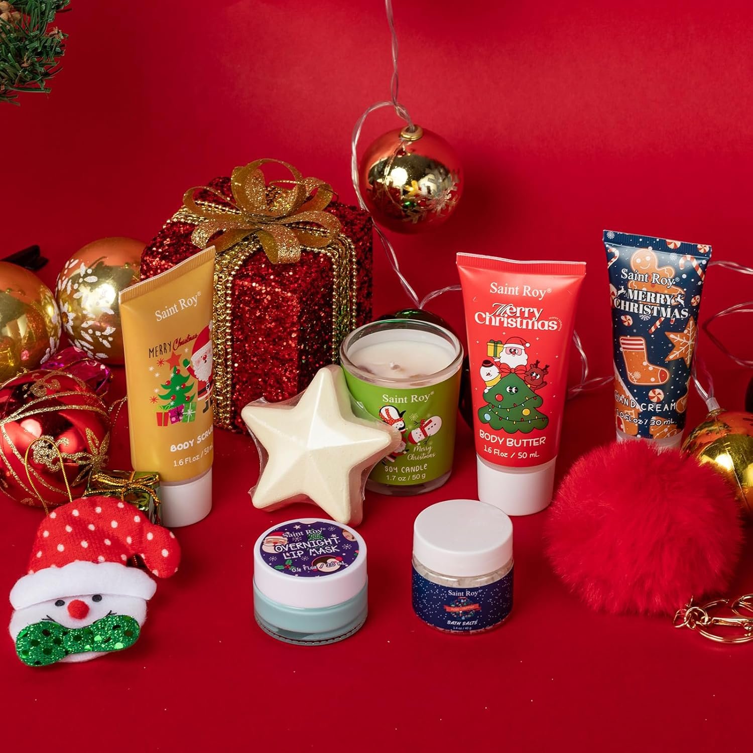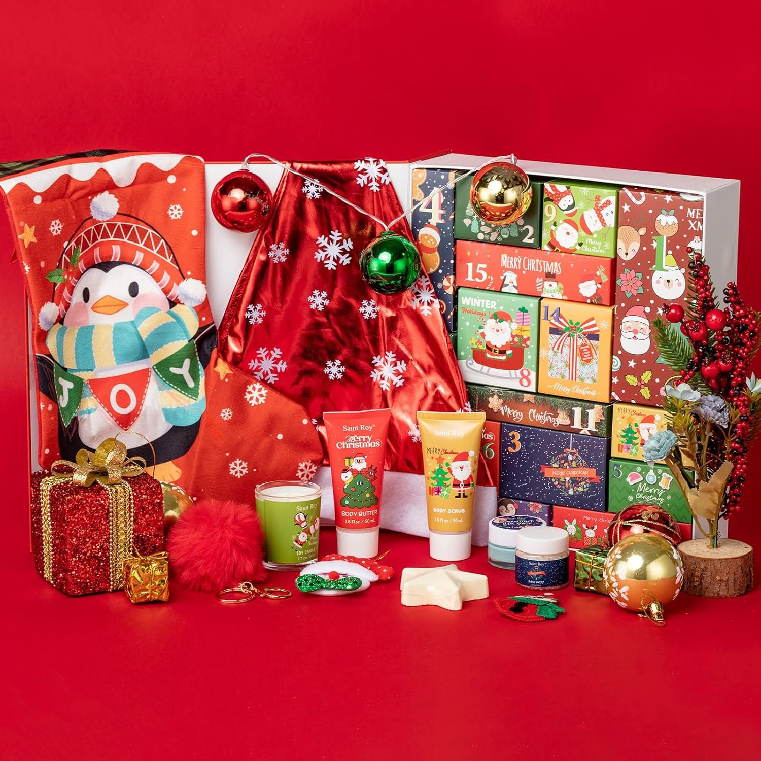 【Comprehensive Contents, All in One Box】The Spa kit include Soy candle, Bath fizzer, Body scrub, Body butter, Hand cream, Bath salts, Overnight lip mask with spoon, Face mask. The advent calendar has many Christmas elements, such as embellished Christmas trees, Christmas Stocking Fuzzy Sock Bag, Christmas Canvas Gift Bag with Drawstring, Christmas tattoo sticker, Christmas Hairpin, Christmas Hat, Christmas Santa Hanging Decorations, Fuzzy Christmas keychain etc.