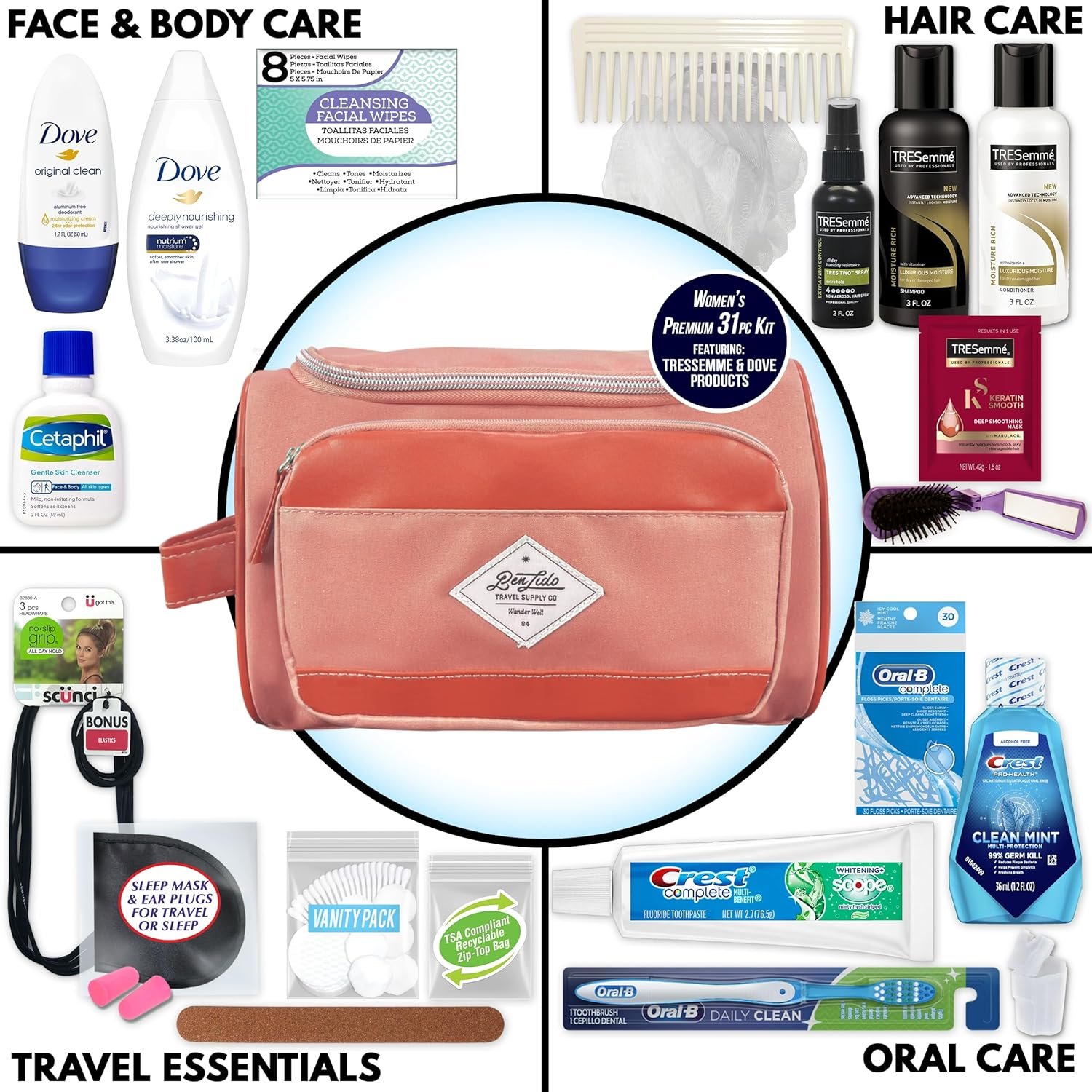 Haircare Ensemble: Tresemme Moisture Rich Shampoo 3 oz., Tresemme Moisture Rich Conditioner 3 oz., Tresemme Hair Spritz 2 oz., and Tresemme Keratin Ultra Smooth Hair Mask 1.5 oz., Face & Body Care: Facial Cleanser 2 oz., Dove Body Wash 3.38 oz., Dove Roll-On Deodorant 1.7 oz., Adult Cleansing Facial Wipes 8 ct., Oral Care: Crest Toothpaste 2.7 oz, Crest ProHealth Rinse Mouthwash 1.2 oz., Oral B Daily Clean Toothbrush, Toothbrush Cap, Oral B Floss Picks 30 ct. Travel Essentials: Nail File, CKI Eye mask and ear plugs, Active Head Bands (6 ct) Vanity Pack (20 Cotton Swabs/6 Cotton Balls/6 Cotton Rounds), Shower Pouf, Shower Comb, Folding brush w/mirror TSA Compliant Quart Size Zip Top Bag in a Large Toiletry Zippered Bag.