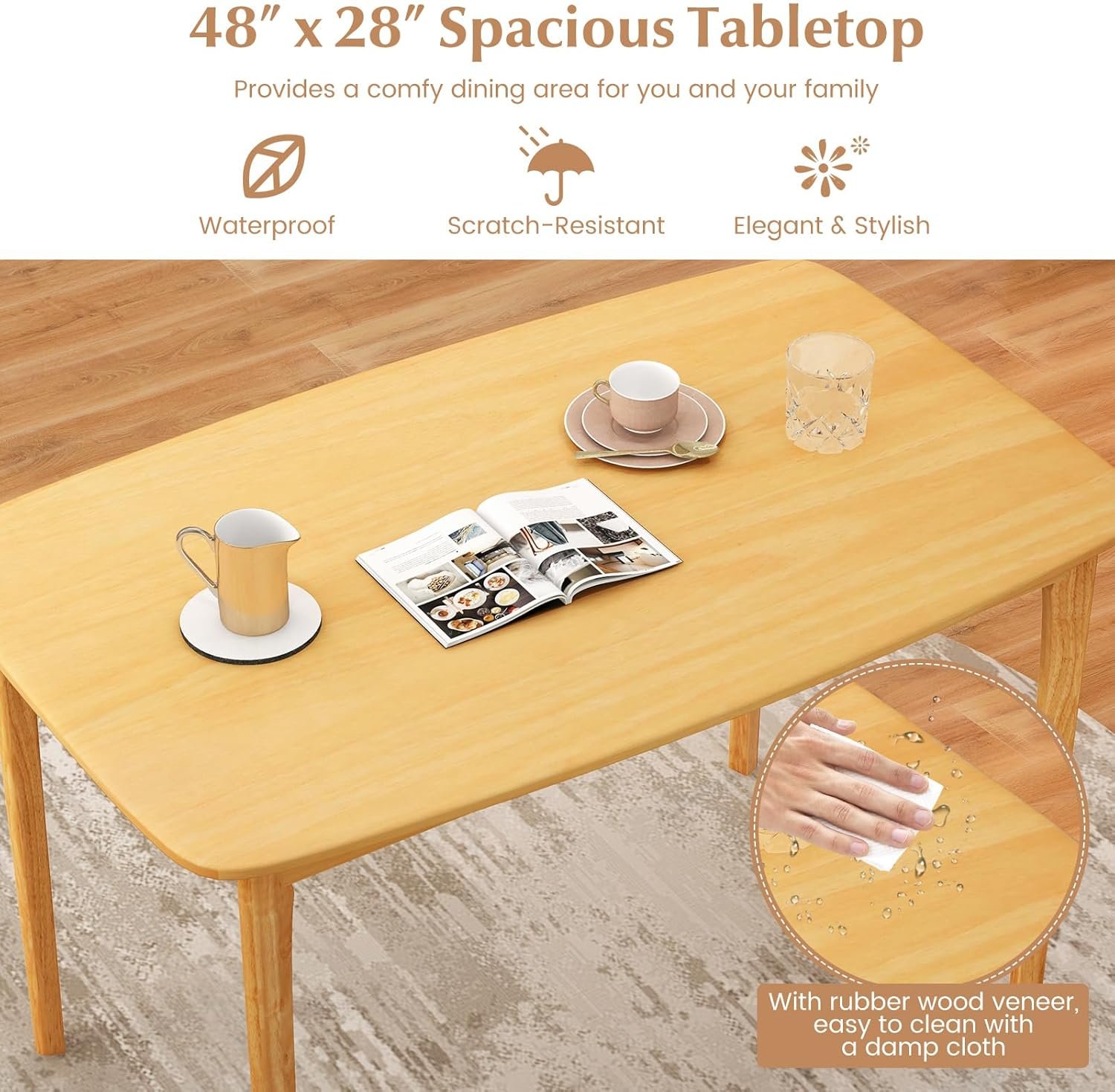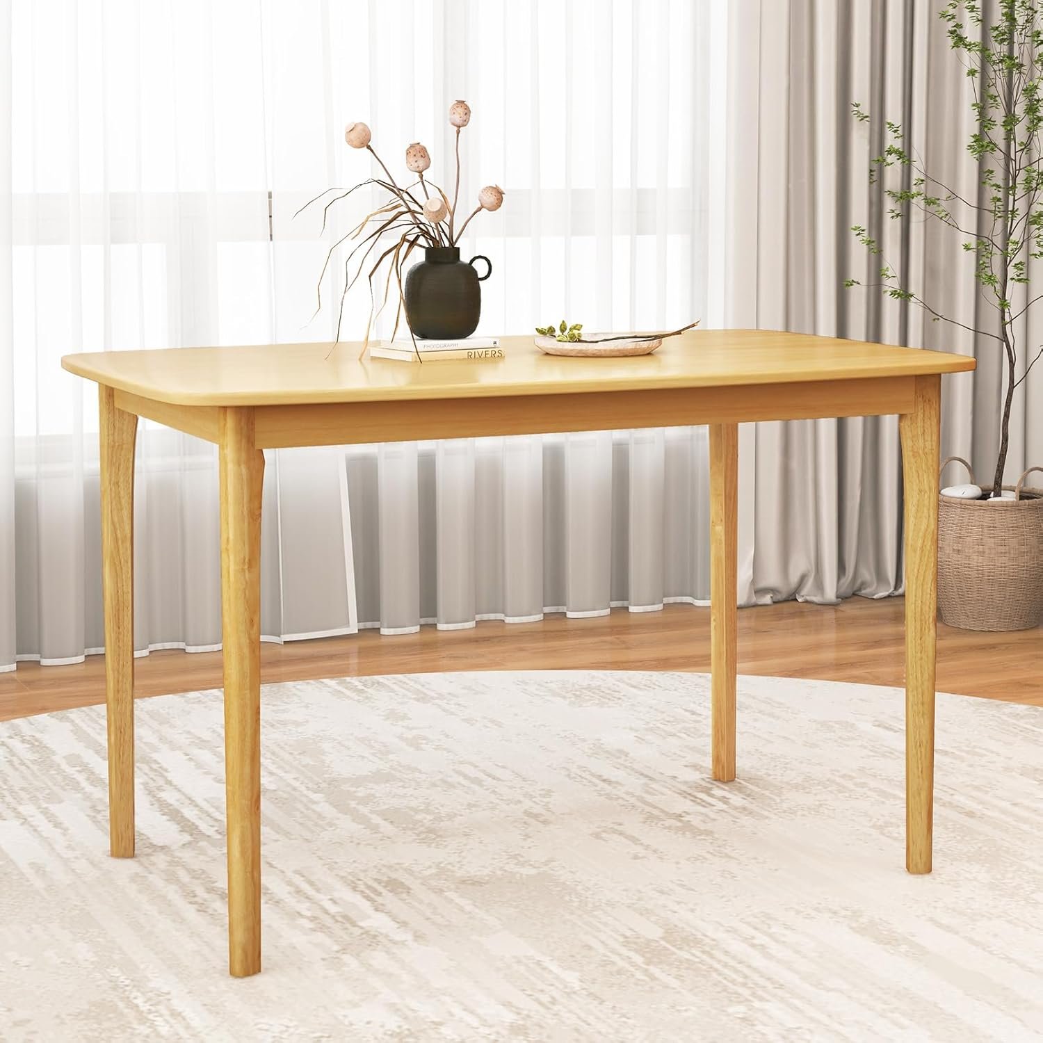 Still looking for a simple dining table to decorate your home? This rectangular dining table will be a good choice for you! Crafted with solid rubber wood legs and thick MDF board, this kitchen table is designed for long-term use and can support weight up to 330 lbs. The 48” dinner table provides ample space for 4 people to sit around. The veneer surface is not only waterproof but also scratch-resistant, ensuring easy cleaning. Featuring smooth round corners, this dining room table ensures safety for both children and adults. This versatile desk can be used as a dinning table or work desk according to your needs. With its beautiful natural wood grain, this solid wood dinner table will be an elegant complement for dining room, kitchen, living room or restaurant.