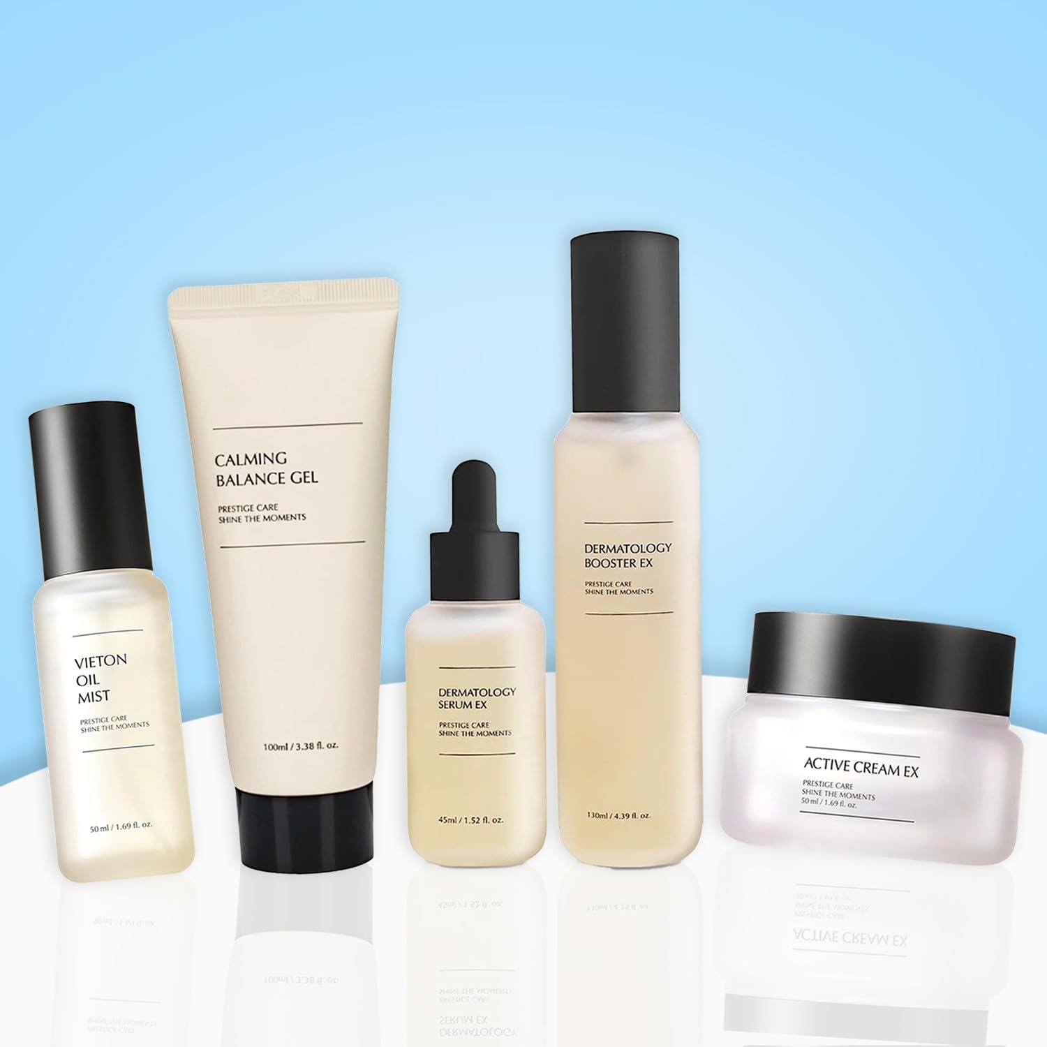 (E.X Line) korean skin care set includes: Oil Mist 50ml + Calming Gel 50ml + Booster 130 ml + Serum 45 ml + Active Cream E.X 50ml.