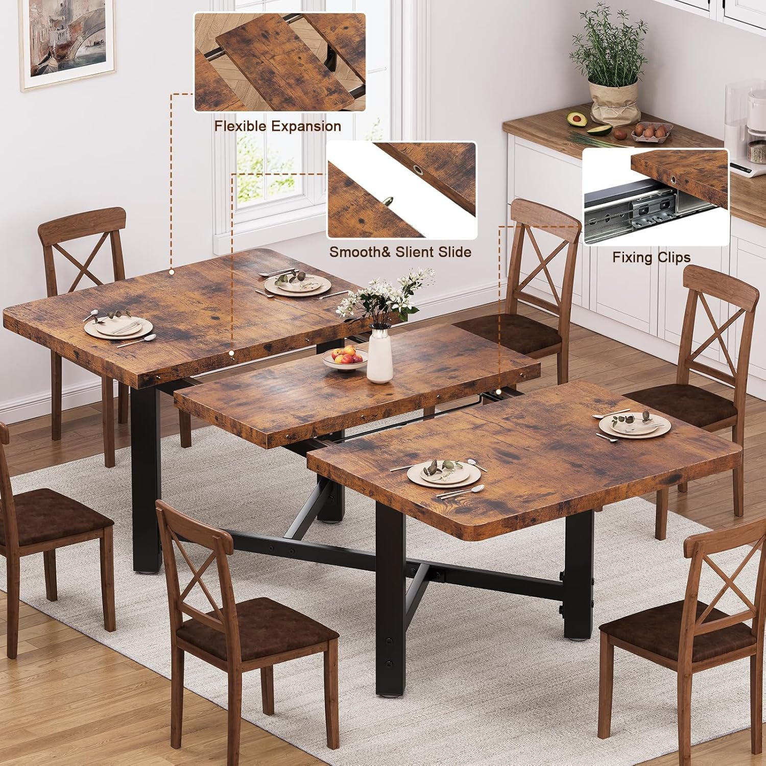 62″ EXTENDABLE DINING TABLE:(Package Includes one Table) This extendable dining table features smooth, silent rails for quick and effortless extension. When not extended, the table measures 47 inches, and it can be extended to 63 inches by adding independent extension boards in the center. The extension leaves can be conveniently stored under the tabletop, saving valuable space. Perfect for small apartments, dining rooms, kitchens, and against-the-wall setups, making it an ideal choice for family gatherings.