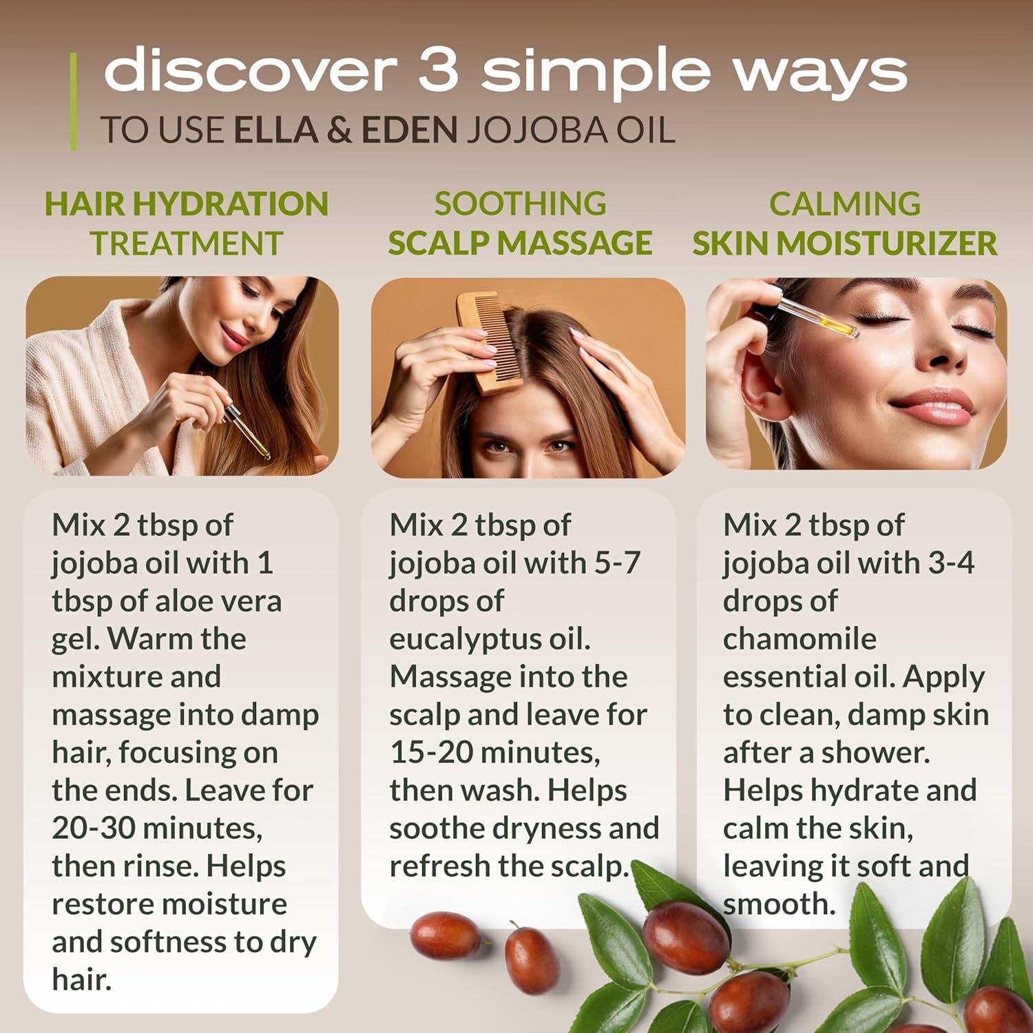 Nourish Your Hair: Organic jojoba oil cold pressed works wonders as jojoba oil for hair. Reduce grease, add shine, and protect against split ends. Massage for jojoba oil for hair growth and a healthier scalp.