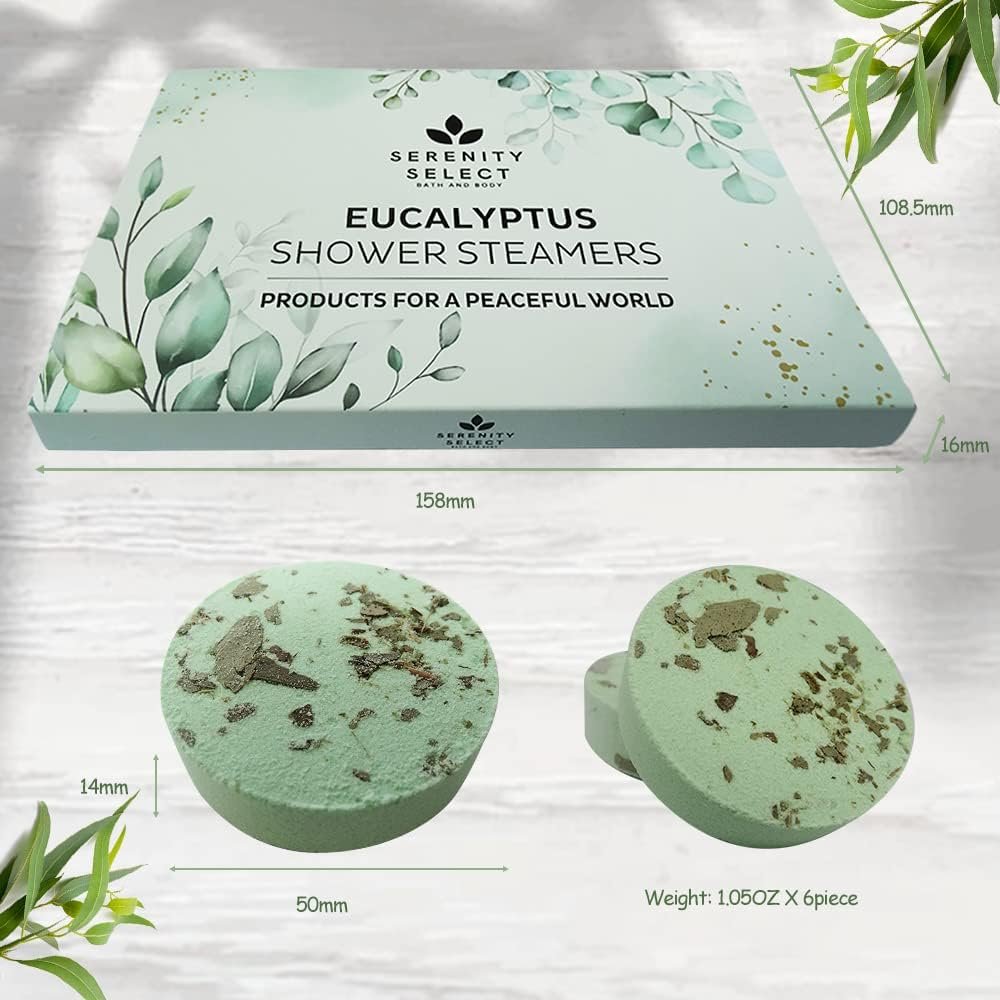 Our Product: Start your morning with a refreshing burst of energy and melt away stress and tension of a long day. Your new Serenity Select shower steamers will reduce your fatigue and produce a therapeutic spa like experience whenever you desire. Our shower steamers are made with only the purest form of natural non-toxic essential oils, giving your shower a strong but natural relaxing aroma. Enjoy your new steamers confidently as they are clean dissolving, plumbing friendly and cruelty-free. Function: Soothing Essential Eucalyptus oil vapors are activated by the hot steam and water from your shower. Unwrap your aromatherapy steamer and place it in the corner of your shower. For best results do not submerge. In a couple of minutes your shower Oasis will be filled with the pleasant scent of natural essential oils. Perfect for Everyone: Men, women and children can all benefit from a luxury Serenity Select steam shower. Self care, energy and peaceful calming are all benefits of an aromatherapy essential oil shower. Give yourself an infusion of peace and wash your daily stress down the drain today. Ingredients: Sodium Bicarbonate, Citric Acid, Plant Essential Oil, Fragrance Oils, Distilled Water