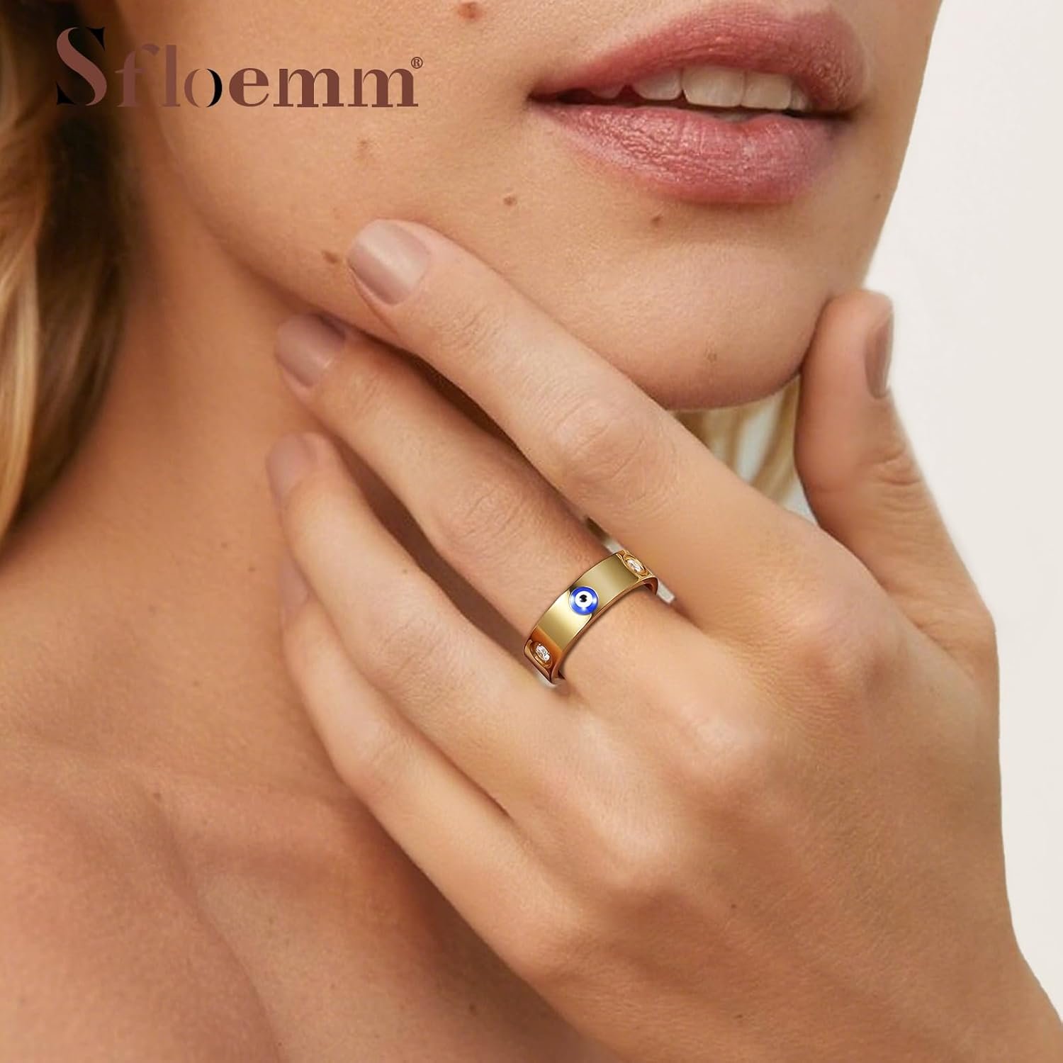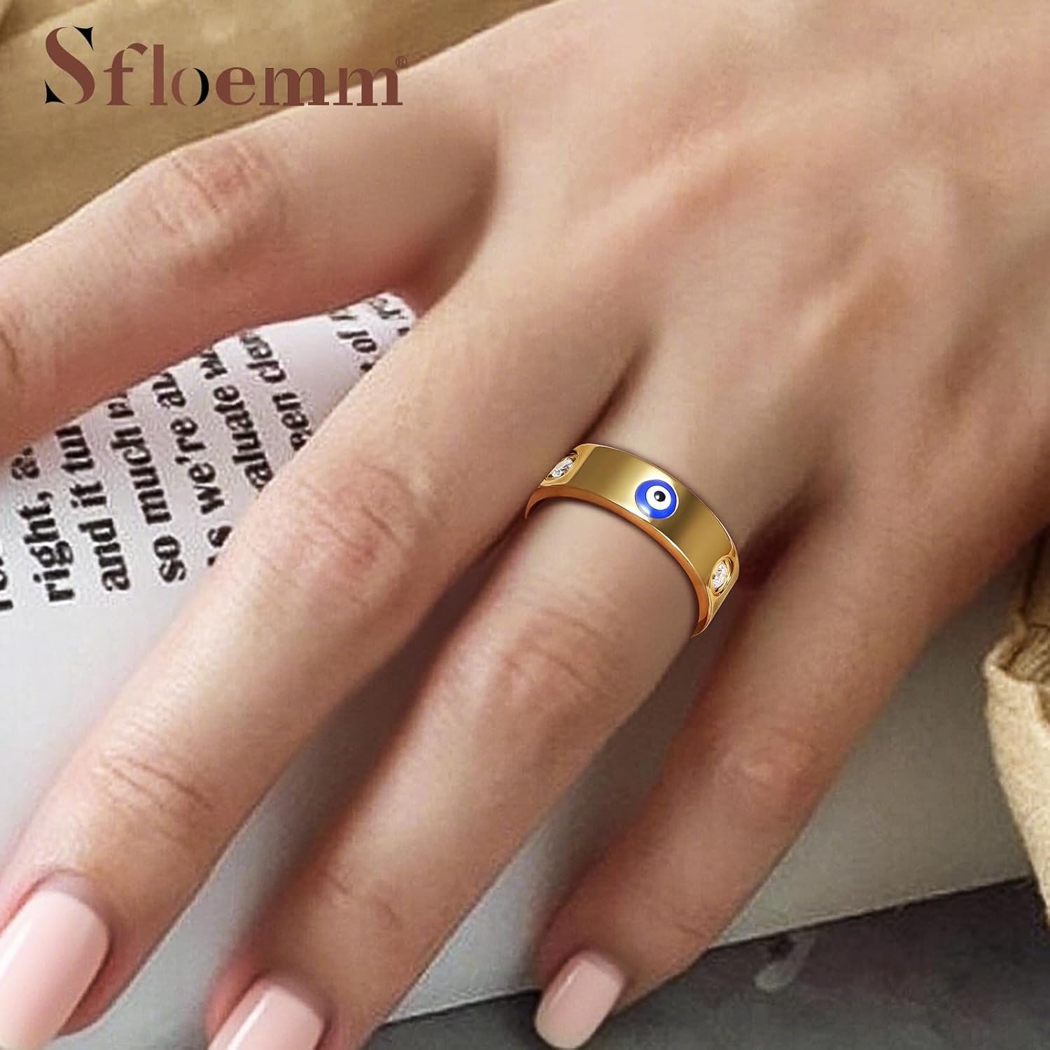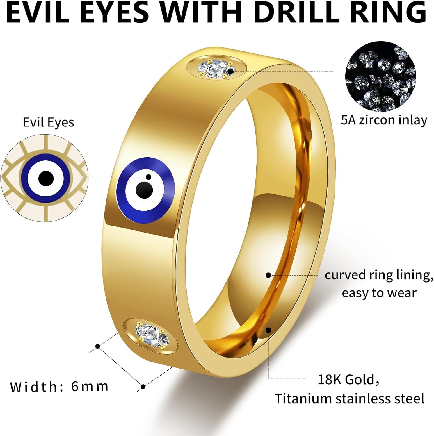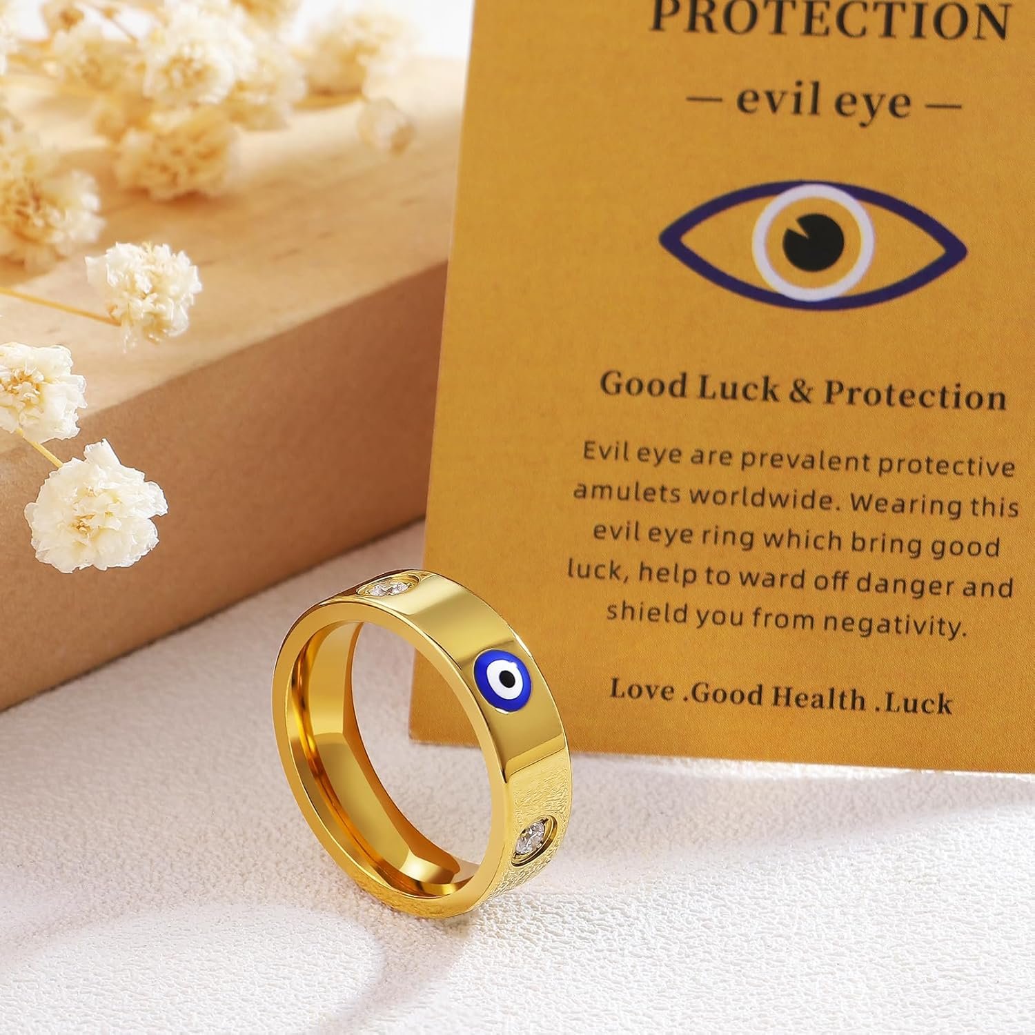 Embrace protection and style with this stunning Evil Eye ring, crafted from premium 18K gold-plated stainless steel. This versatile piece serves as both a meaningful talisman and a fashionable accessory, featuring an elegant evil eye design accented with sparkling cubic zirconia. Perfect as a wedding band, anniversary ring, or everyday statement piece, its stackable design allows for creative combinations with other rings. The durable stainless steel construction ensures long-lasting wear without tarnishing, while the classic band style suits any occasion. Available in sizes 5-11, this ring makes a thoughtful gift for special occasions – whether for a wife, bride, girlfriend, sister, or friend. The timeless design combines traditional symbolism with contemporary elegance, making it a meaningful addition to any jewelry collection. Each ring comes with a protection-themed presentation card, adding an extra special touch to this meaningful piece of jewelry.