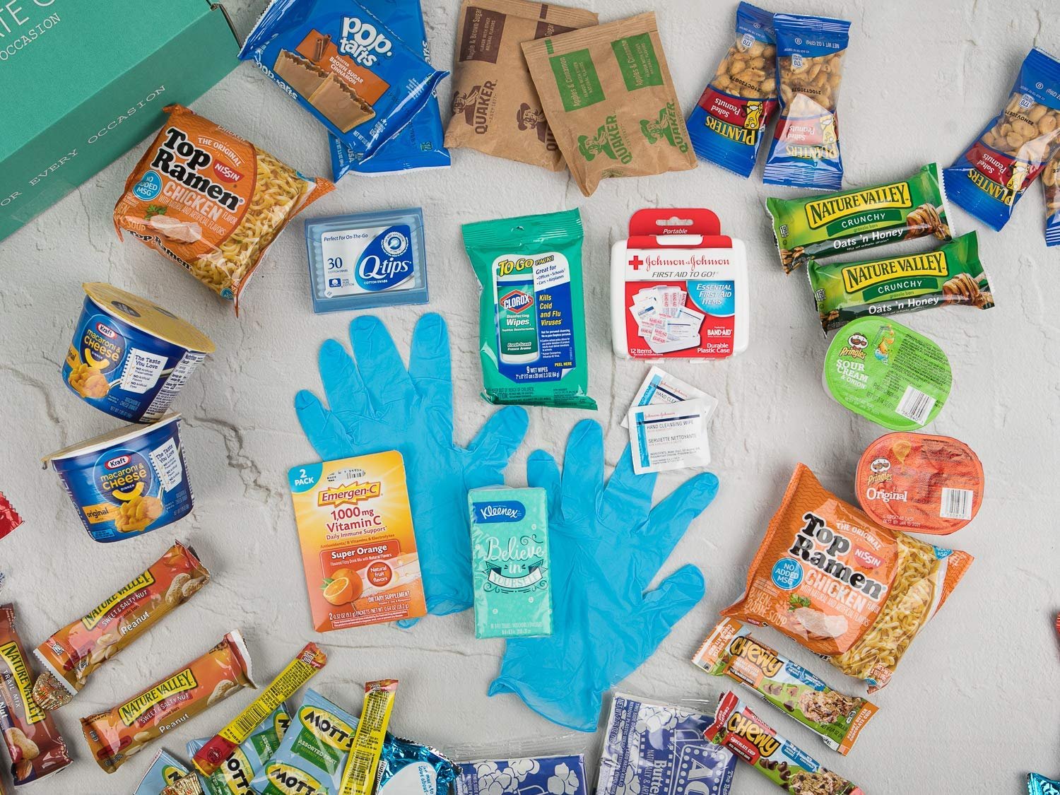 First Aid Kit Including:Cleansing Wipes, Johnson + Johnson First Aid Gauze PadsBAND-AID Brand Flexible Fabric Adhesive Bandages & Knuckle Adhesive Bandages3-Ply FacemaskLatex GlovesQtipsErmergen-CKleenexDisinfectant WipesRamen NoodlesAct II PopcornMac & Cheese CupsPop-TartsQuaker OatmealSkittles & Starburst, and Hershey’s MinisMotts GummiesPlanters PeanutsTwizzler’sSlim JimsNature Valley Fruit & Nut, Crunch Bar, and Sweet & SaltyQuaker Chewy BarsCheez-ItsRice Krispies TreatsTGIFriday’s Potato Skin ChipsAirheadsPringles