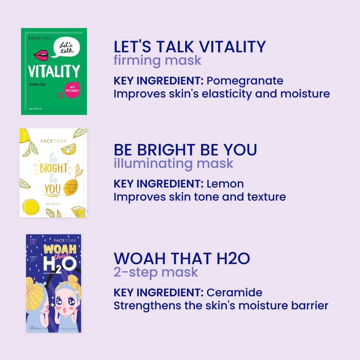 BENEFITS: Each individual mask has their own specific benefit like improving skin HYDRATION, CALMING acne and redness flare-ups, MOISTURIZING dry skin, SOOTHING irritations, and leaving your skin feeling SMOOTH and SOFT!