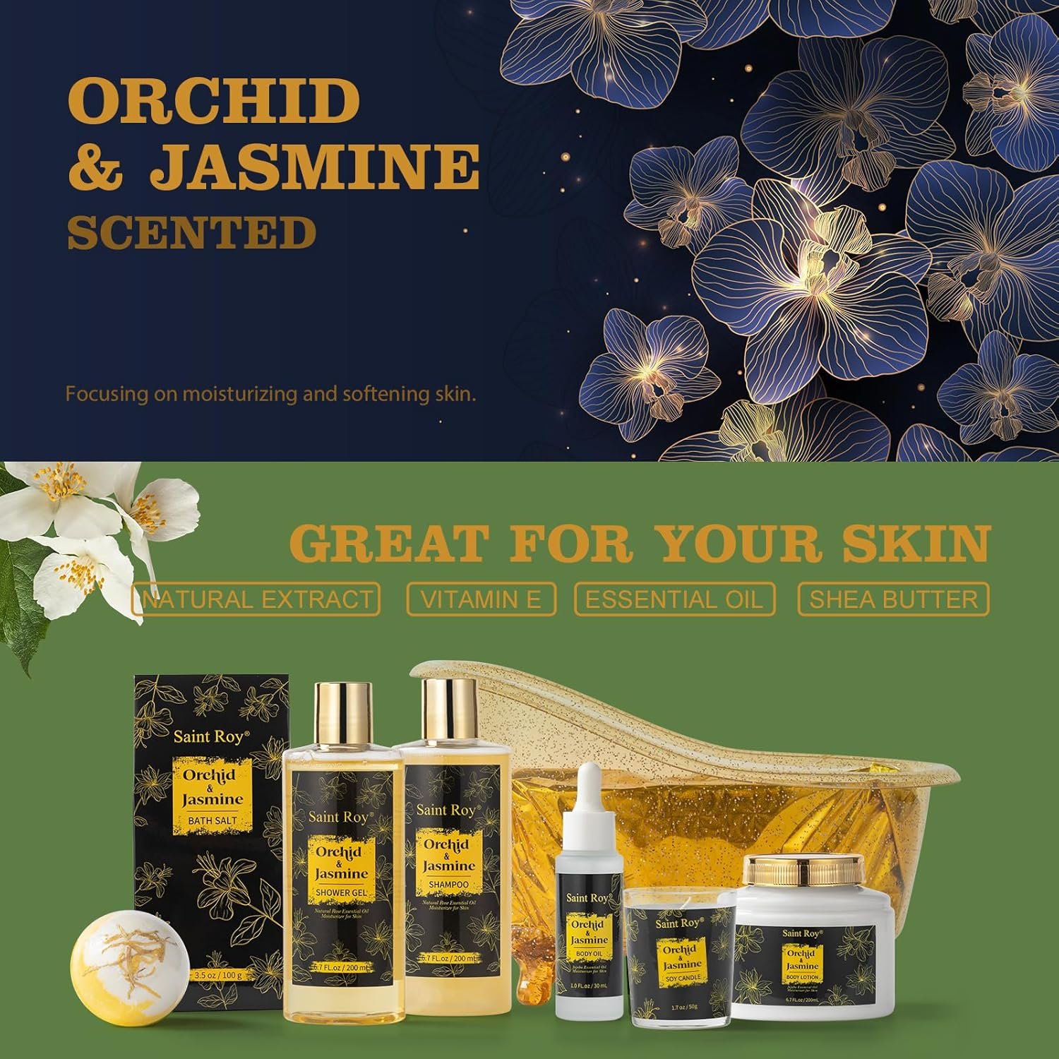 8pcs bath gifts for women Bath & Body Gift Set for Women. This bath and body gift basket relaxing gift set includes: Shower Gel, Shampoo, Body Lotion, Spa Soy Candle, Bath Salt, Jojoba Body Oil, and Dried Flower’s Bath Bomb, arranged in a reusable Gold Shine bath tub for attractive storage and display. Bath tub spa kit helps you at home spa.mother day gift basket