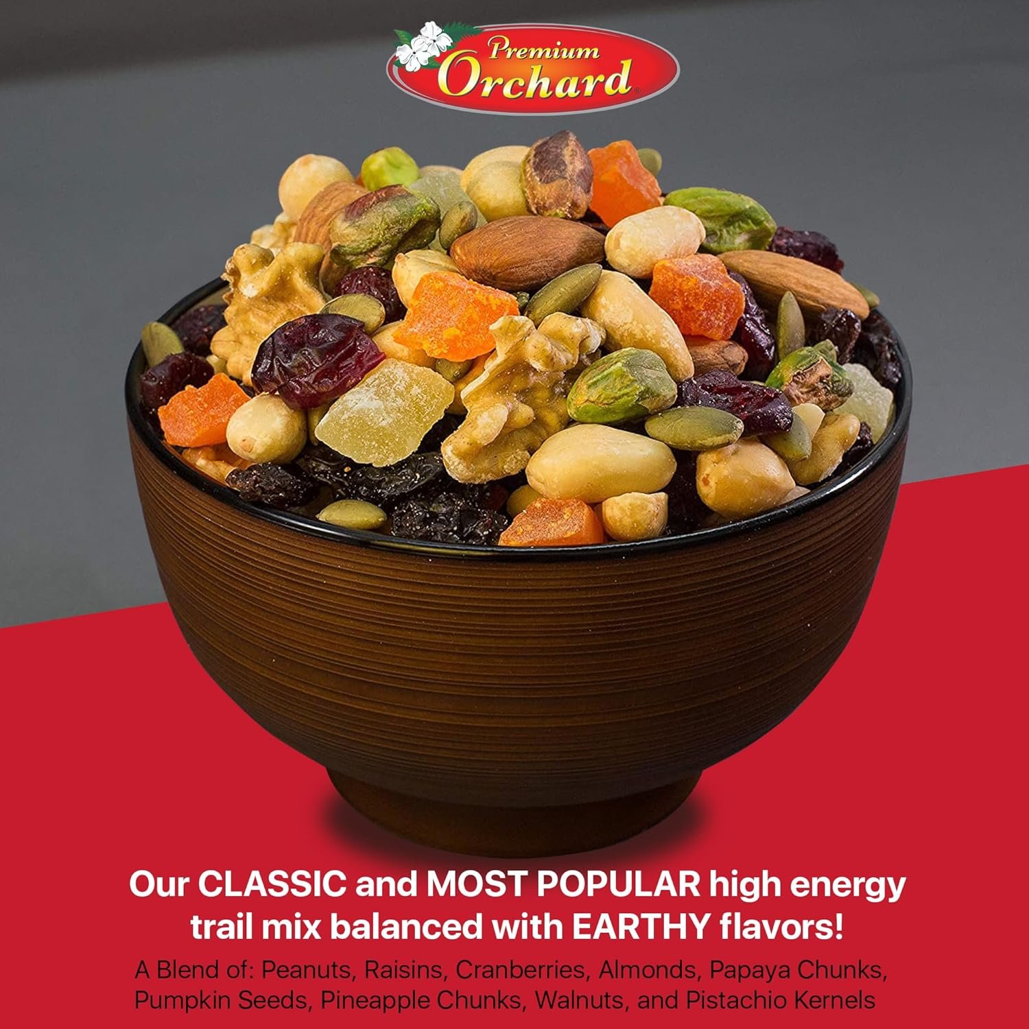 ✅ MIXED NUTS: Healthy snacks for adults & kids are a Premium Orchard speciality! This high energy trail mix is balanced with earthy flavors from peanuts, almonds, pumpkin seeds, walnuts, & pistachios, all dry roasted to a lightly salted crunch.