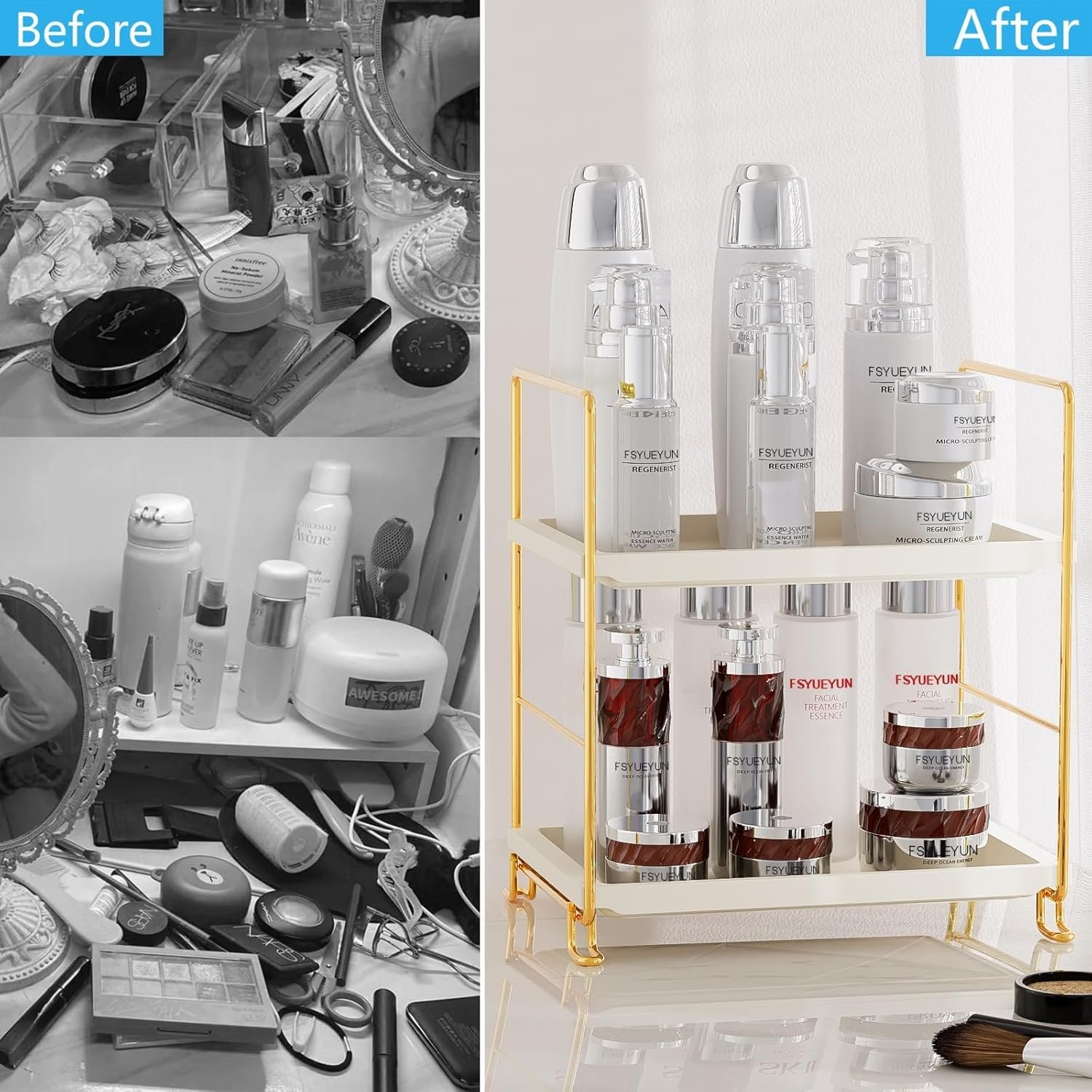 Multifunctional Storage, Versatile Scenes: The bathroom organizer features a two-tier structure for sorting different height skincare products, cosmetics, and toiletries. Perfectly adaptable to various locations like bathroom countertops, bedroom vanity tables, or kitchen sinks