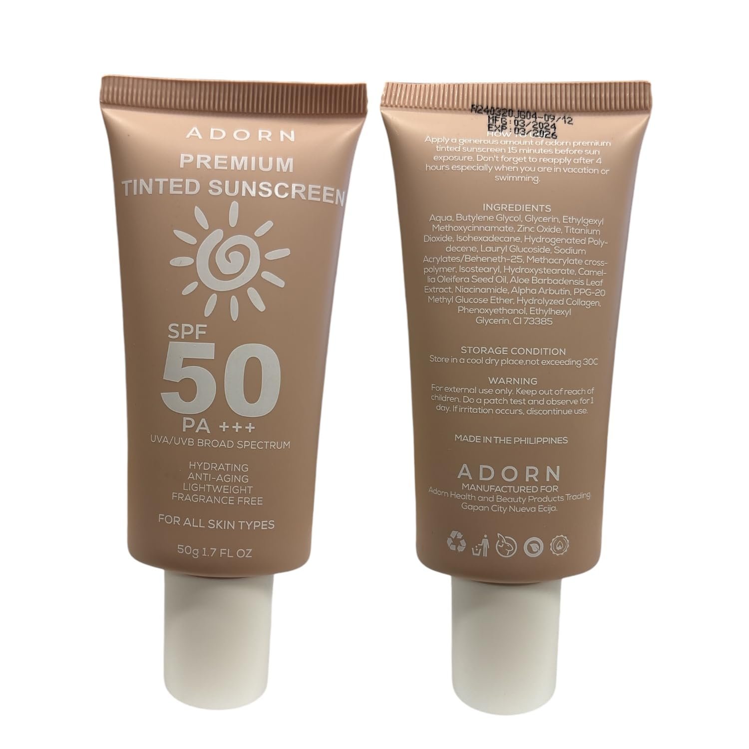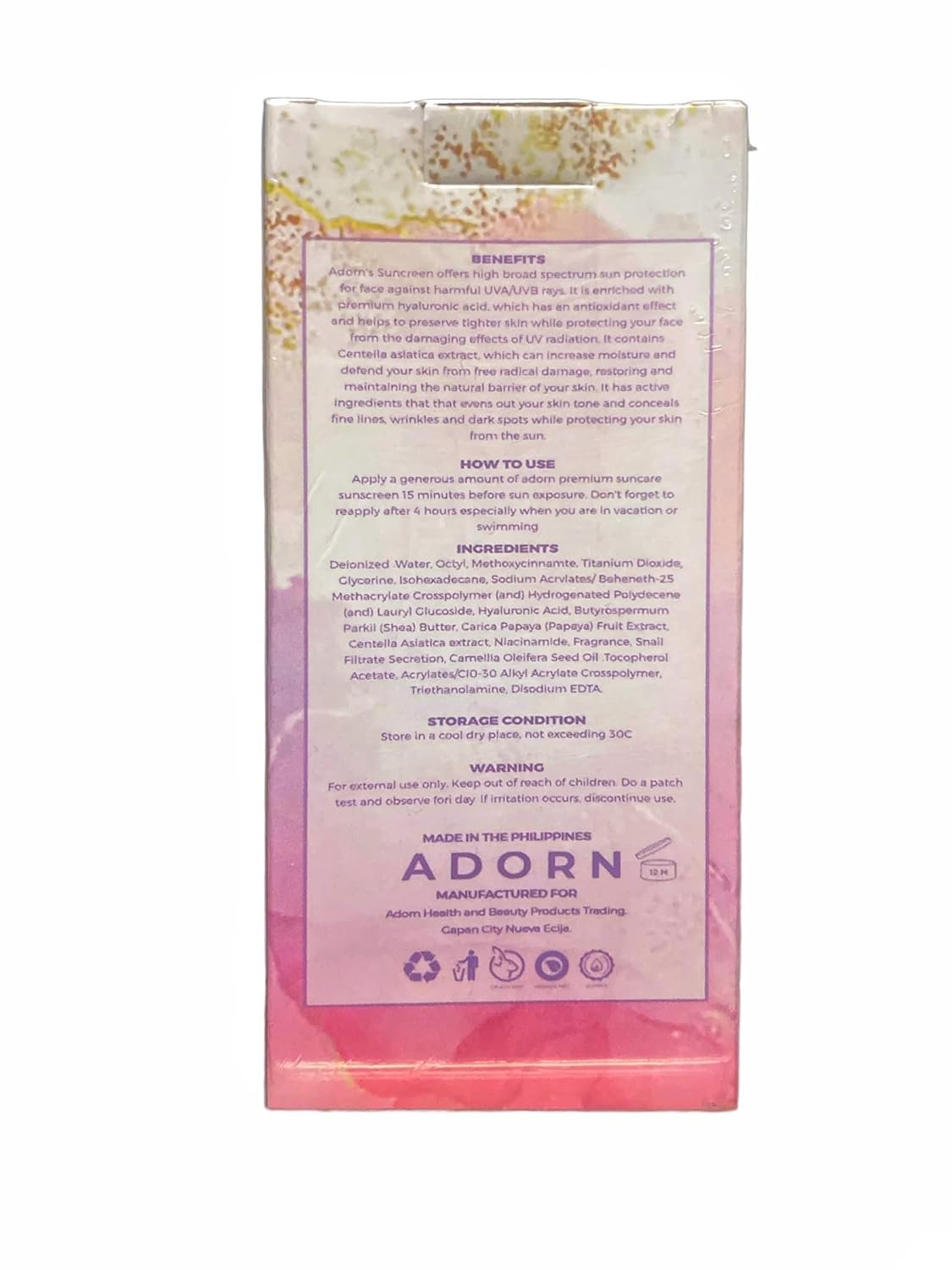 HOW TO USE: Apply a generous amount of adorn premium sun care sunscreen 15 minutes before sun exposure. Don’t forget to reapply after 4 hours especially when you are in vacation or swimming.