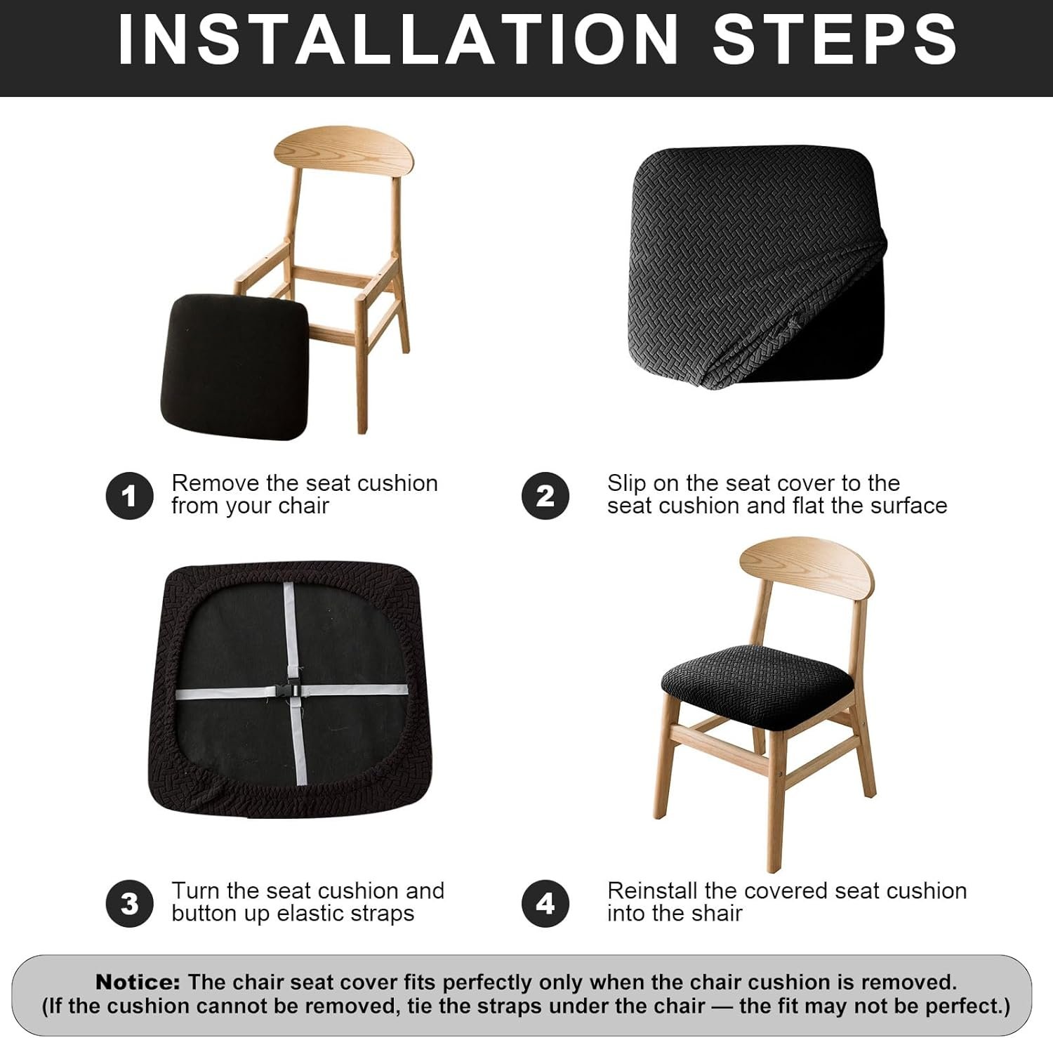 Washing installation instructions: Gently place the chair covers for dining room on the seat cushion and Button up. Elastic straps and 4 straps secure the cover firmly in place to avoid slipping or sliding. Machine washable. Low drying. No ironing required.
