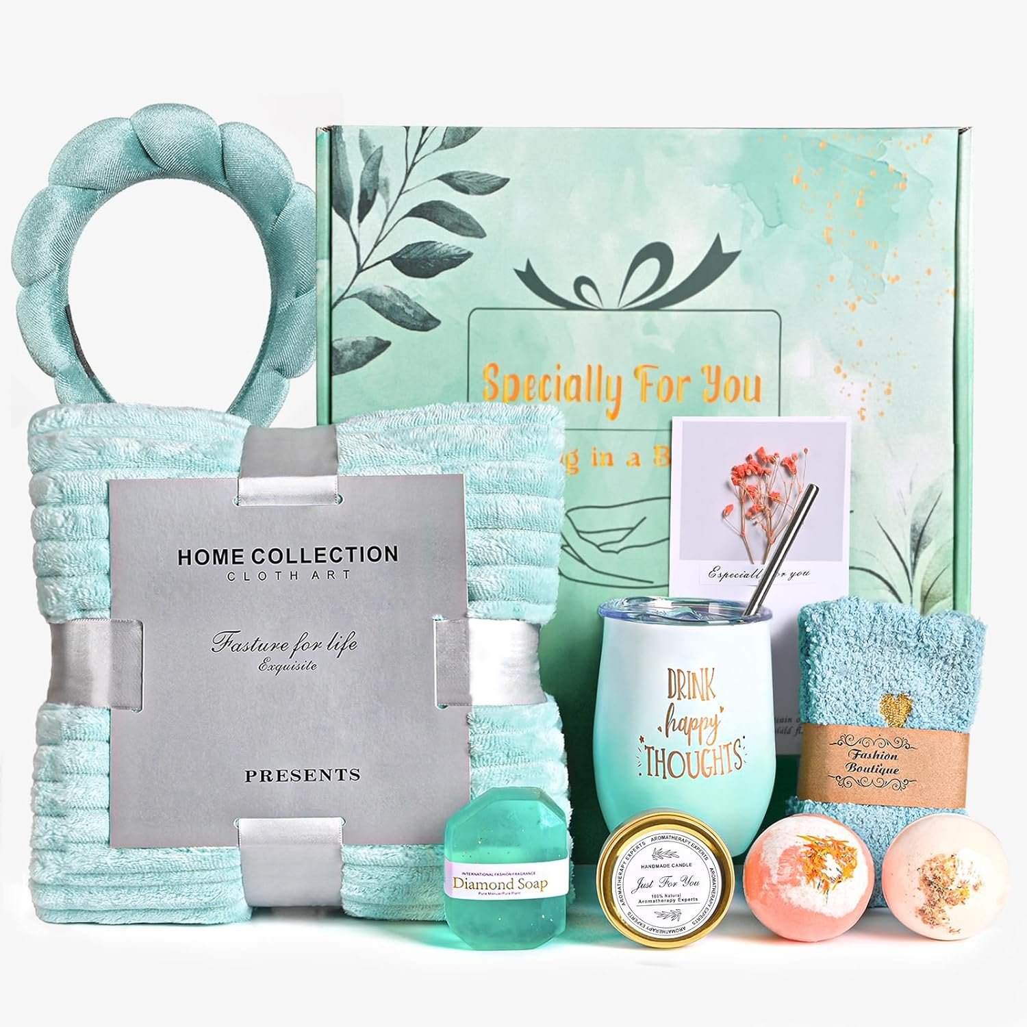 🎉【GIFT BASKET FOR WOMEN】: 🎀 39×59 inches Knitted Tassel Blanket, 12 oz Stainless Steel Insulated Tumbler, 100% Soy Wax Candles, Handmade Soap, 2 x Bath Bombs, 1 pair Cozy Fuzzy Socks, 1 pc Spa Headband, “Especially for You” Gift Card, “Hug in Box” Gift Box.