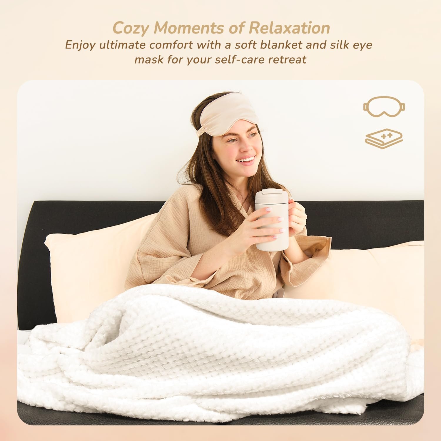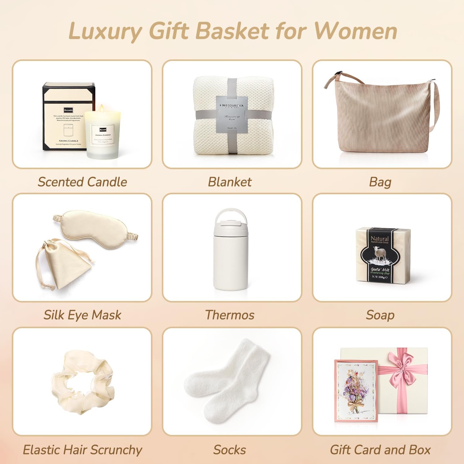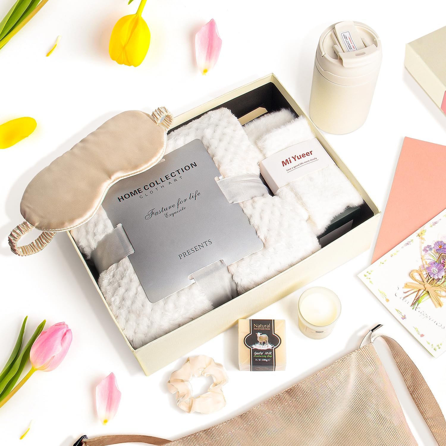 Intimate Gift Basket for Women: This relaxation gift set brings warmth and tranquility. It includes a scented candle, soft blanket, shoulder bag, silk eye mask, stainless steel mug, soap, hairband, cozy socks, and a heartfelt gift card. An ideal way to show support and care