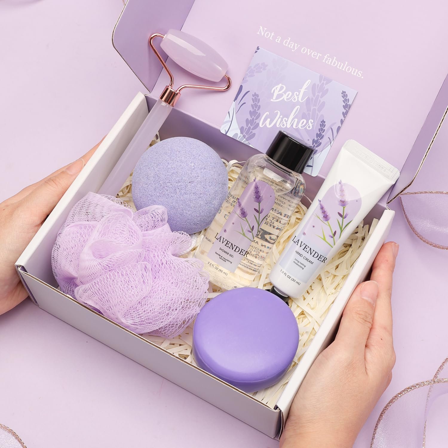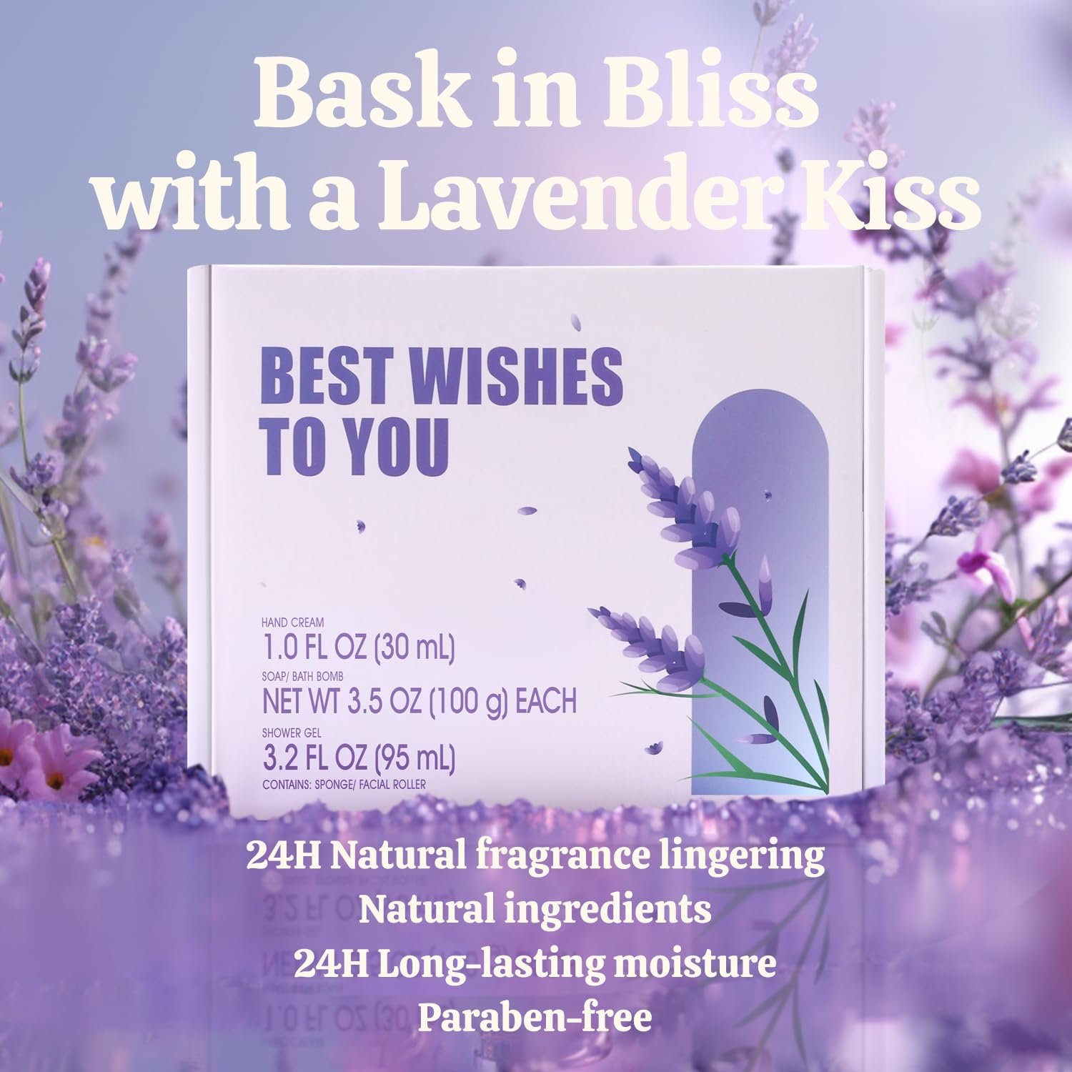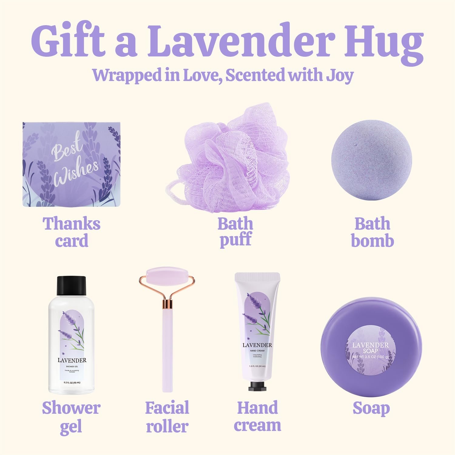 Luxury 6-Piece Spa Gift Set: Premium self-care essentials including a hand cream, soap, bath bomb, shower gel, bath sponge, facial roller, and lavender bubble bath – thoughtfully curated for ultimate relaxation.