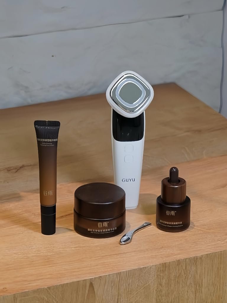 【3-Step Anti-Aging System】 Clinically proven to reduce wrinkles by 34.2% in 28 days. Set includes: ✔ Firming Face Cream (with silver spoon) ✔ Collagen Serum (amber-textured) ✔ Eye Cream (with ceramic massage tool)