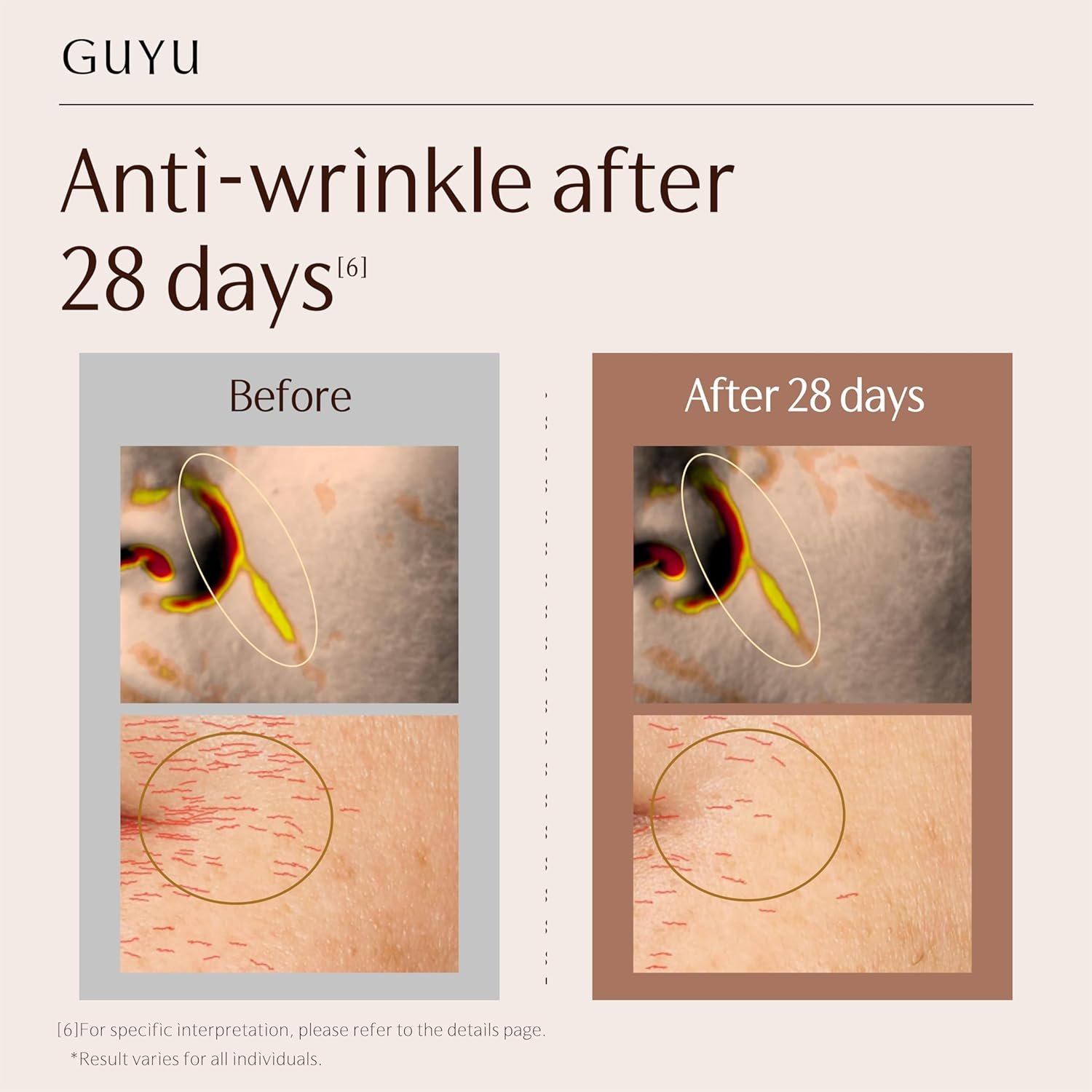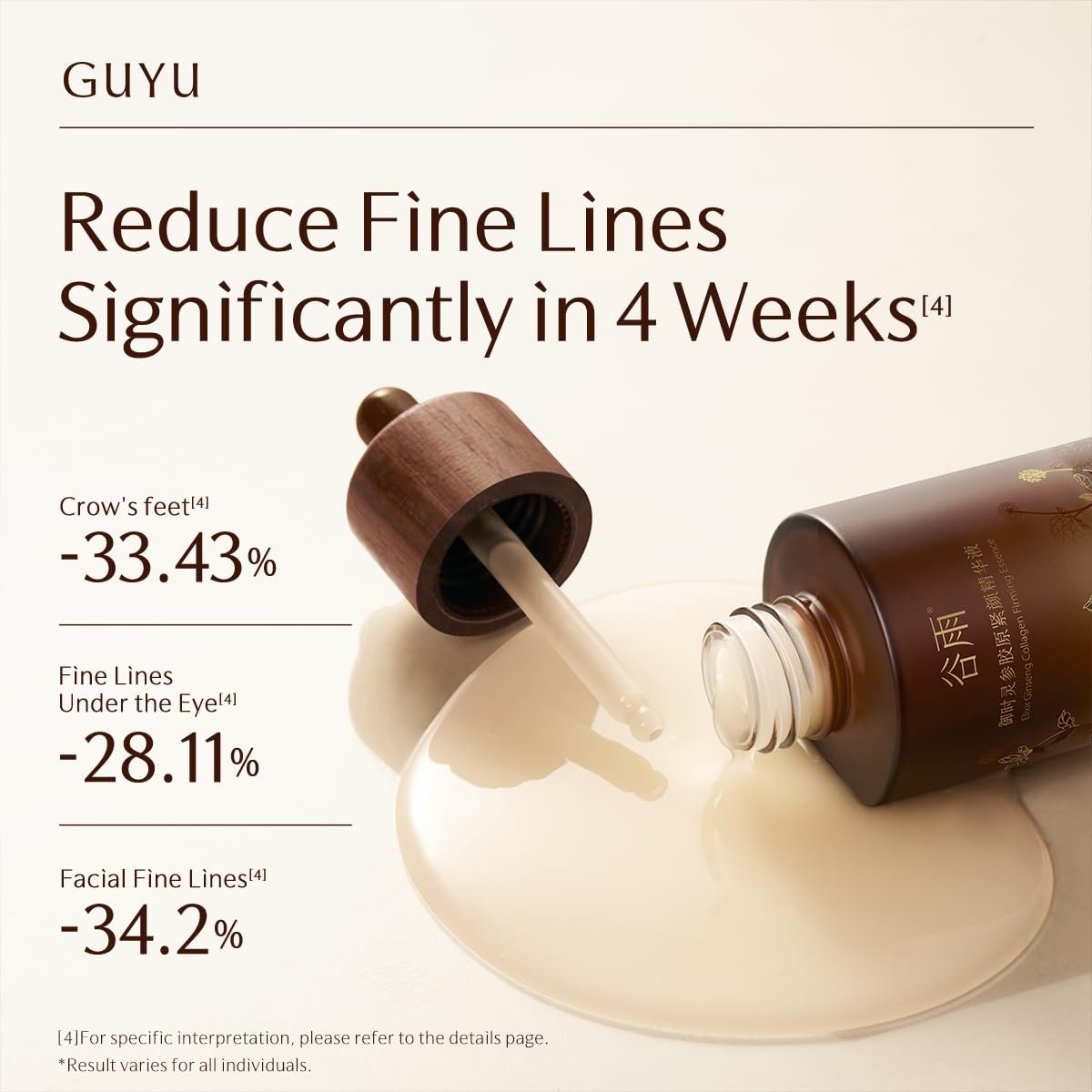 Notes “Anti-aging” refers to combating the initial signs of skin aging, such as skin laxity and wrinkles. The product has firming and anti-wrinkle effects, hence it is claimed to have anti-aging properties. [1] Refers to GINSENOSIDES in the ingredient list, which have firming and anti-wrinkle properties. [2] Data source: VITARGENT (INTERNATIONAL) BIOTECHNOLOGY LIMITED Report VI-R20231917S-1AR. The report claims that, 24 hours after the use of GUYU ginseng extract, it significantly promotes the expression of the col1a2 gene, which is associated with Type I collagen in zebrafish, indicating an effect on the regeneration of Type I collagen. This supports the claims of anti-wrinkle and firming benefits, although actual results may vary from person to person. [3] Data source: SGS Guangzhou Report GZCP-CHE23000552-03_CN. The report claims that, compared to the control group, based on fibroblasts, GUYU’s sample ginseng root extract at a concentration of 5.0% significantly increased the relative content of elastins. Actual results may vary from person to person. [4] Data source: Guangzhou Zhongkejian Tech Testing Co Ltd Report ZKJ-GX-BG240417-01. The report claims that 30 test participants showed reduced facial fine lines, under-eye fine lines, and crow’s feet after using the product for 2 weeks. The specific data corresponds to the test results after 4 weeks of use. [5] The product ingredient list does not contain the following 10 ingredients: fluorescent agents, preservatives (as listed in the 2015 edition of the Cosmetics Safety Technical Specifications), alcohol, colorants, parabens, mineral oil, phenoxyethanol, heavy metals, hormones, or synthetic fragrances. [6] Data sourced from Guangzhou Zhongkejian Technology Testing Co., Ltd. (Report No. EB241212-01). After 7 days of use, 31 participants showed improvements in skin firmness (F4), elasticity (R2), and radiance. The data reflects results after 28 days of use. Actual results may vary. [7] GUYU’s patented technology as a result of in-house research: Method for the Extraction and Conversion of Rare Ginseng Saponins and Applications. (Chinese Invention Patent, Patent No.: ZL202410284475.1) [8] Data source: Guangzhou Qingnang Biotech Co Ltd. The content of Rg3 ginsenosides was increased by 14 times through the application of enzyme engineering conversion technology. *Result varies for all individuals.