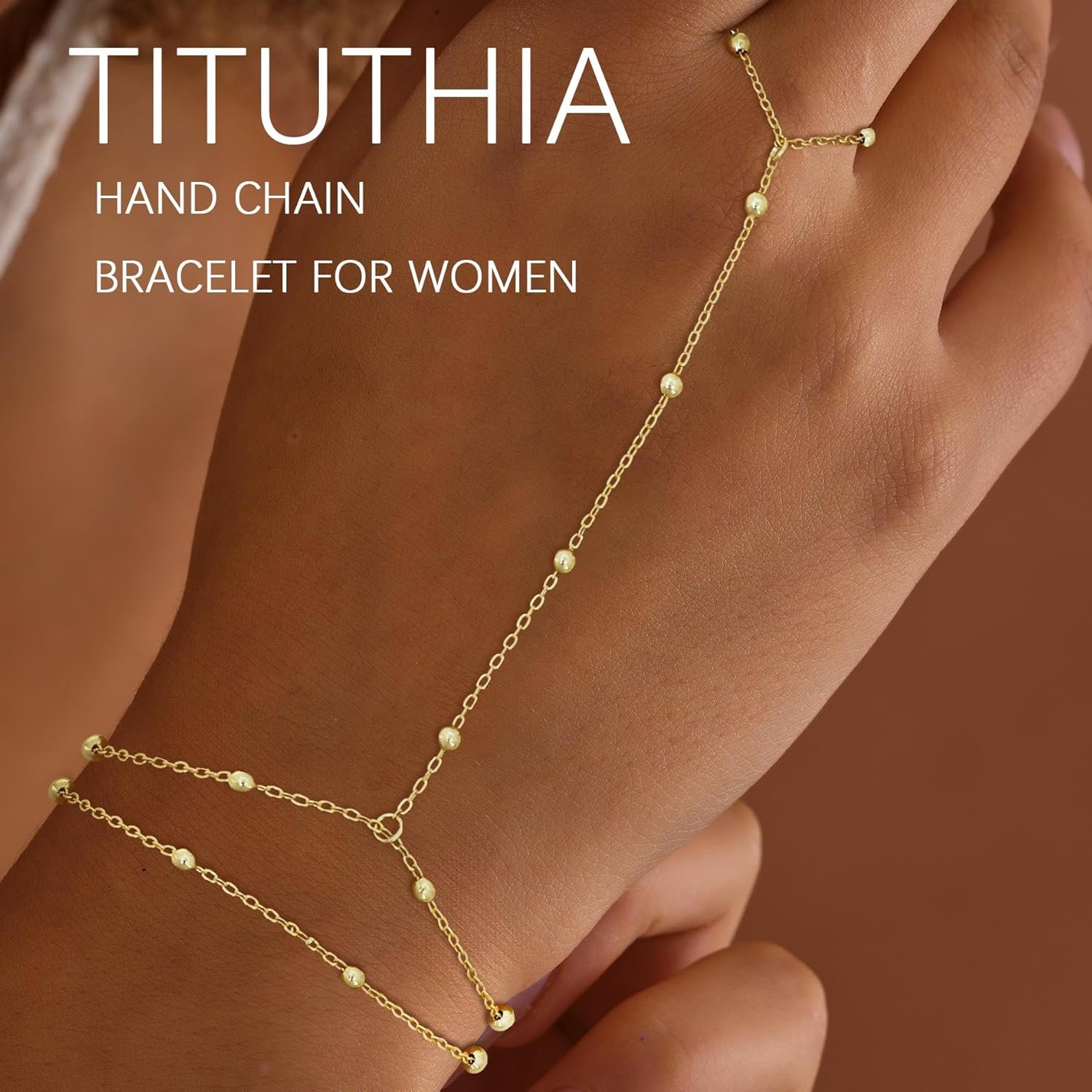 Gold Bracelets for Women Trendy, Dainty Gold Hand Chain Bracelet Stack 14k Gold Plated Finger Ring Bracelet Hand Chain Cz Layered Beaded Gold Bracelets for Women Non Tarnish Gold Jewelry Gift