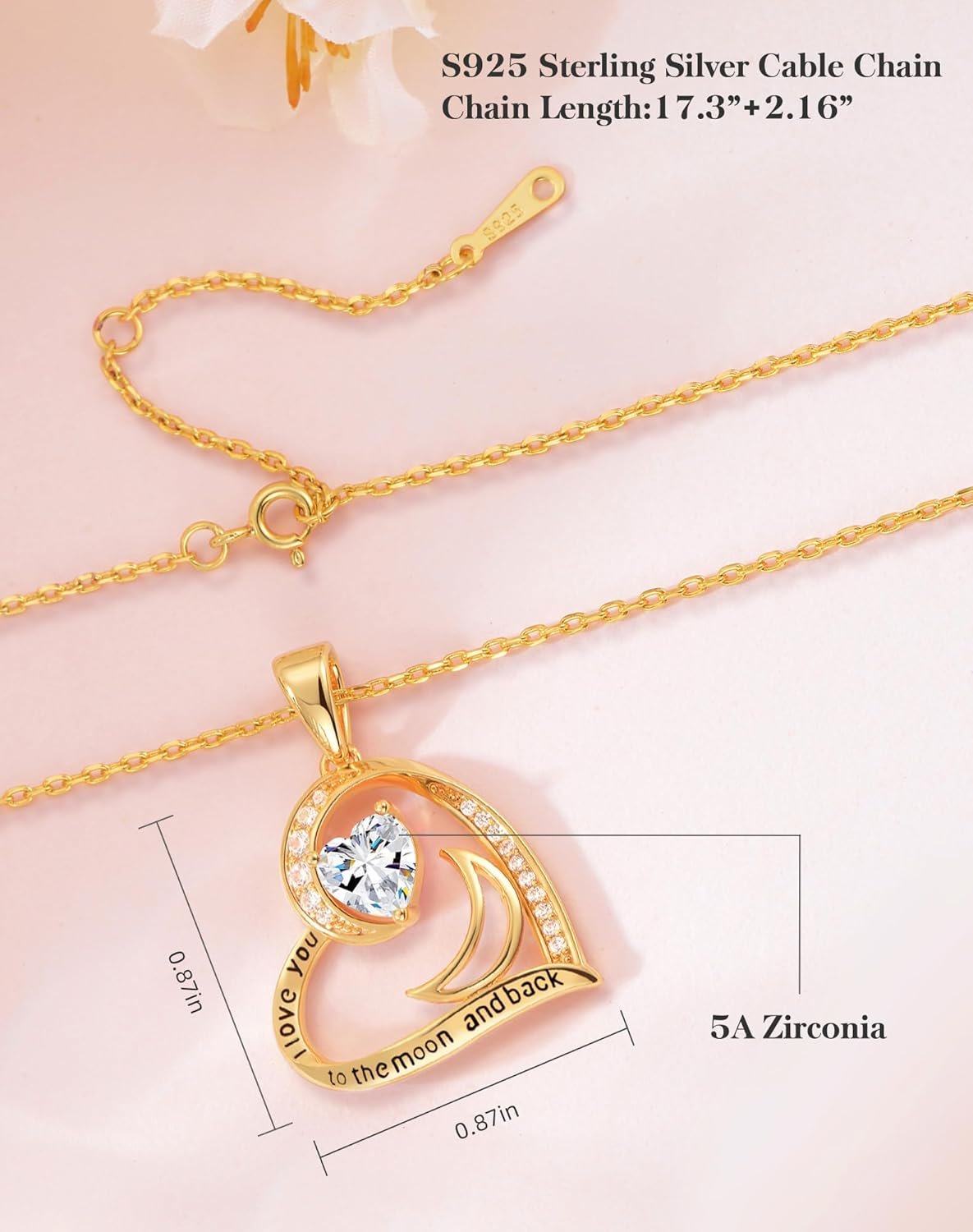 “I love you to the moon and back” heart necklace is 18K gold plated and the chain is S925 sterling silver. Adjusable Lengthen Chain–The high-quality chain can be adjusted to the length you want according to your needs.